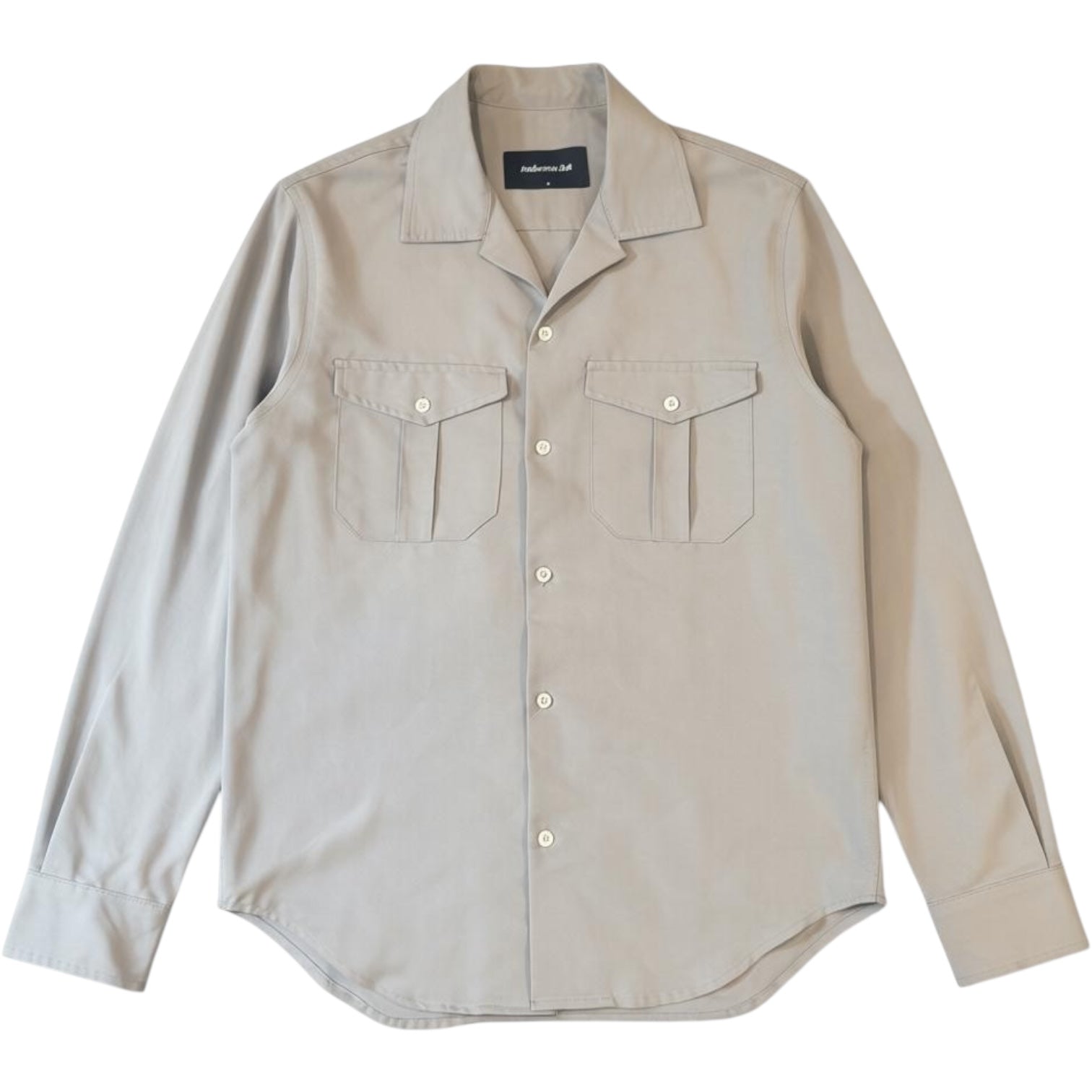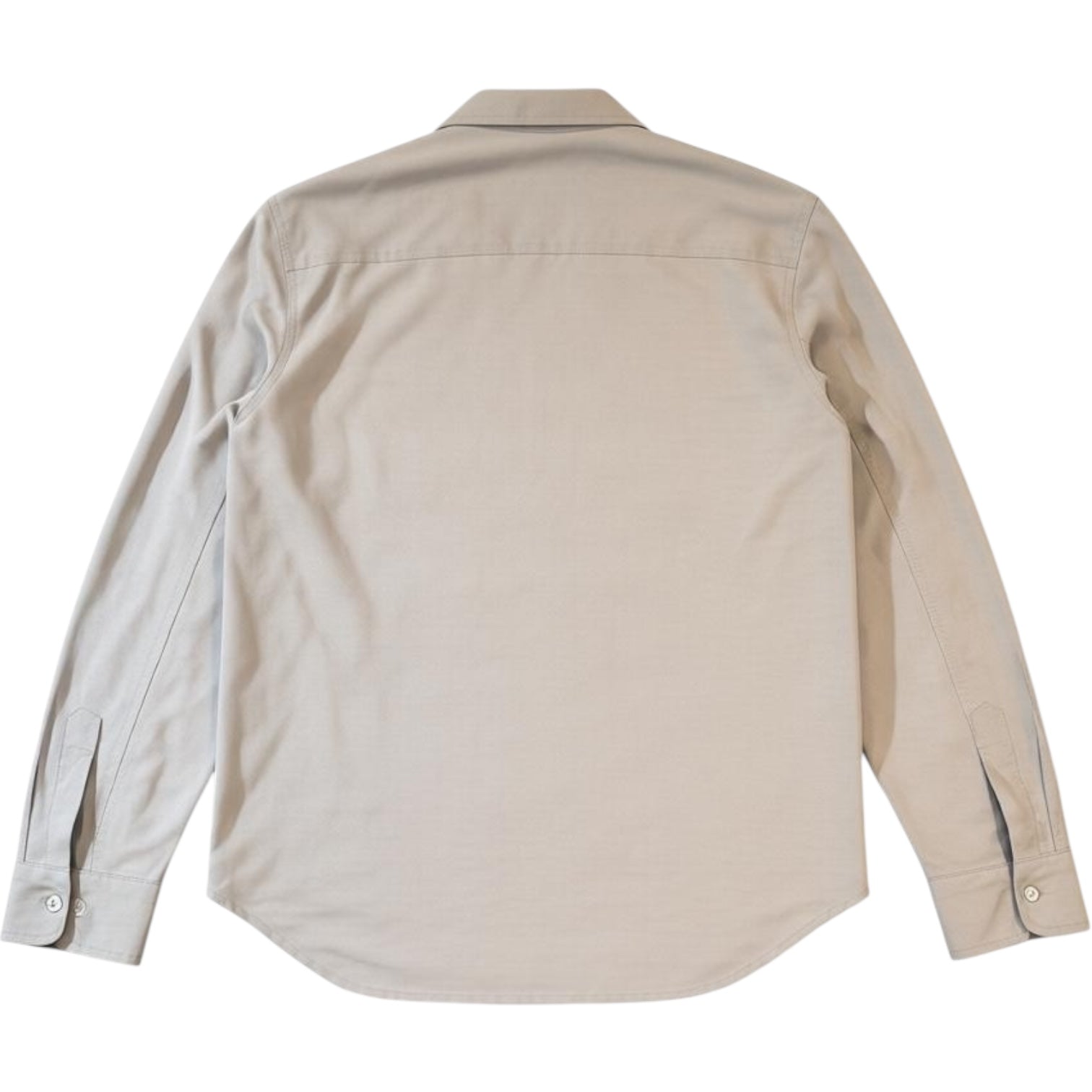 Andersson Bell Collared Work Shirt in Grey, tagged size M measures 20.5 pit to pit 17.5 shoulders 27 sleeves 28 length. In good used condition, some fraying threads near hem and two minor discolorations at back not visible when worn.
