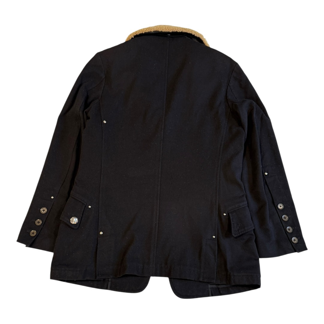 Yohji Yamamoto Autumn 2005 Lambskin Fur + Horsehide Studded Wool Jacket in Black, tagged size 1 fits larger measures 20.5 pit to pit 18 shoulders 25.25 sleeves 30 length. This rare Yohji piece features a removable lambskin fur collar backed with thick horsehide complemented by shining silver studs, snaps and zippers. 7 pocket design with buttoned cuffs on black cotton wool blend body. In good condition for age, missing one silver button visible on back, minor pilling.