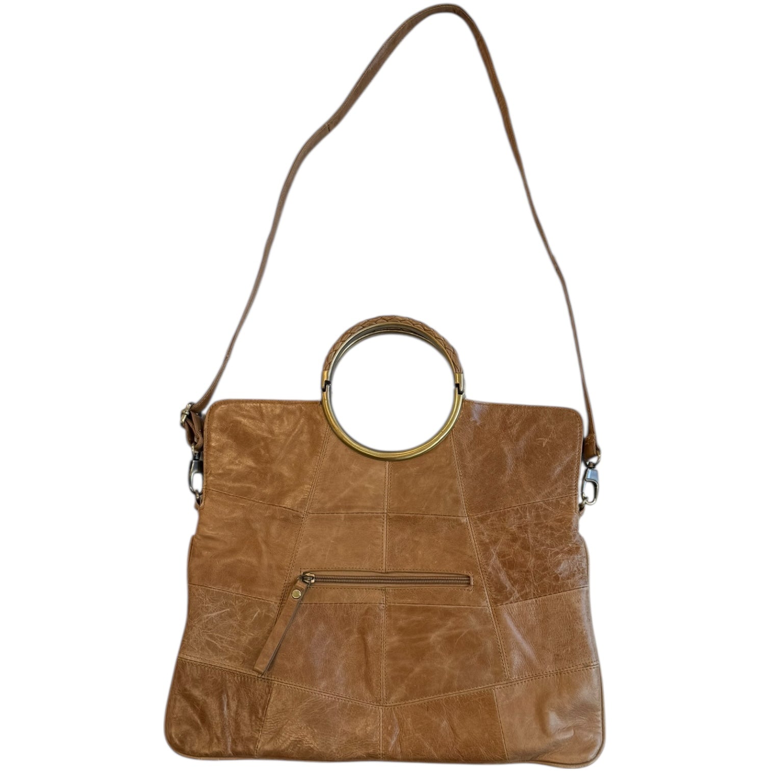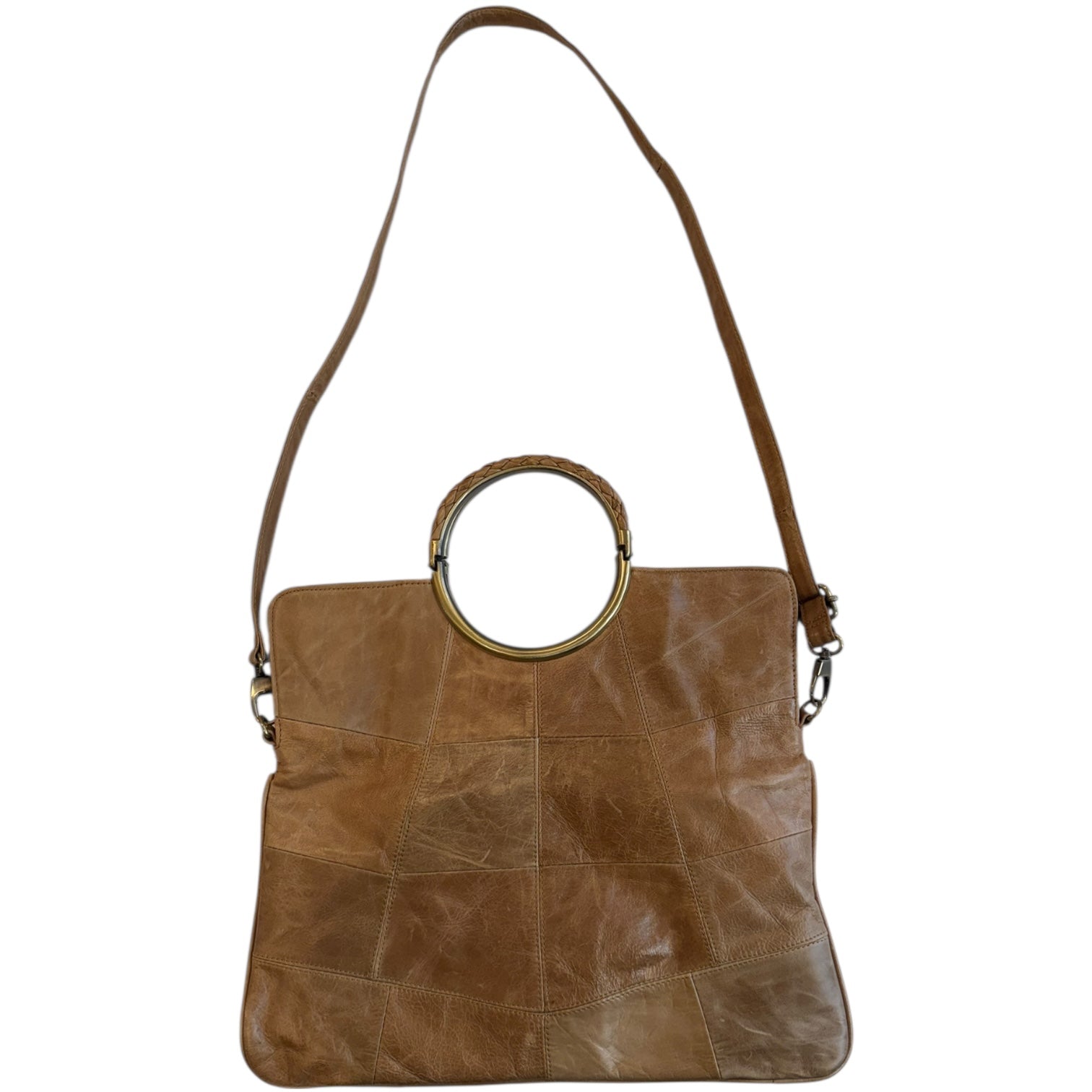GOA Patchwork Leather Shoulder Bag. Features a fold-over top and removable strap for use as a clutch. No flaws, 3 total compartments.