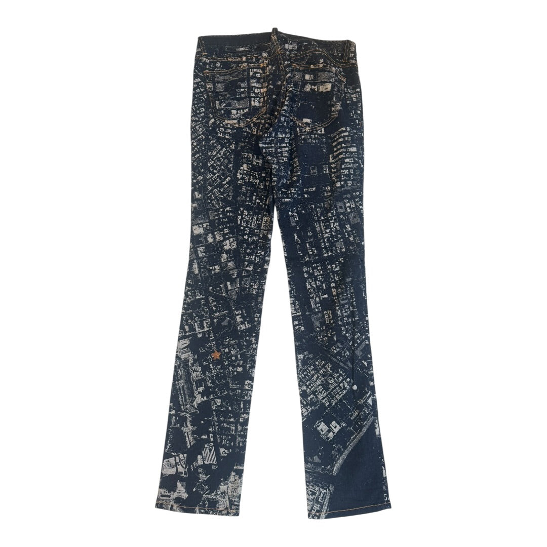 Issey Miyake SS2013 Manhattan Cityscape Low Rise Denim with silver ‘you are here’ star, slim straight jacquard denim with a slight amount of stretch in a blue / grey colorway. size 3 measures 32 waist 10 front rise 13.5 back rise 32 inseam