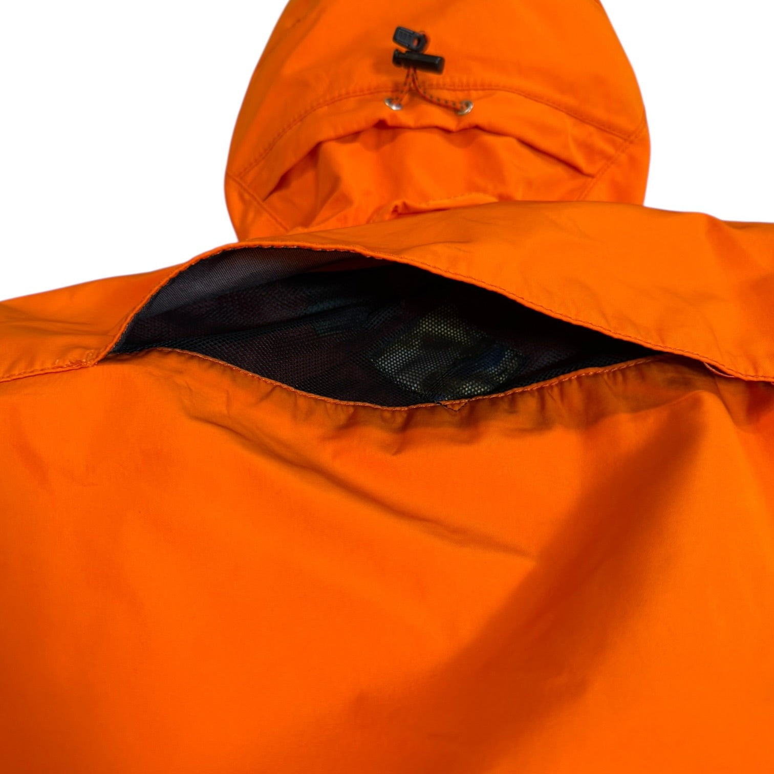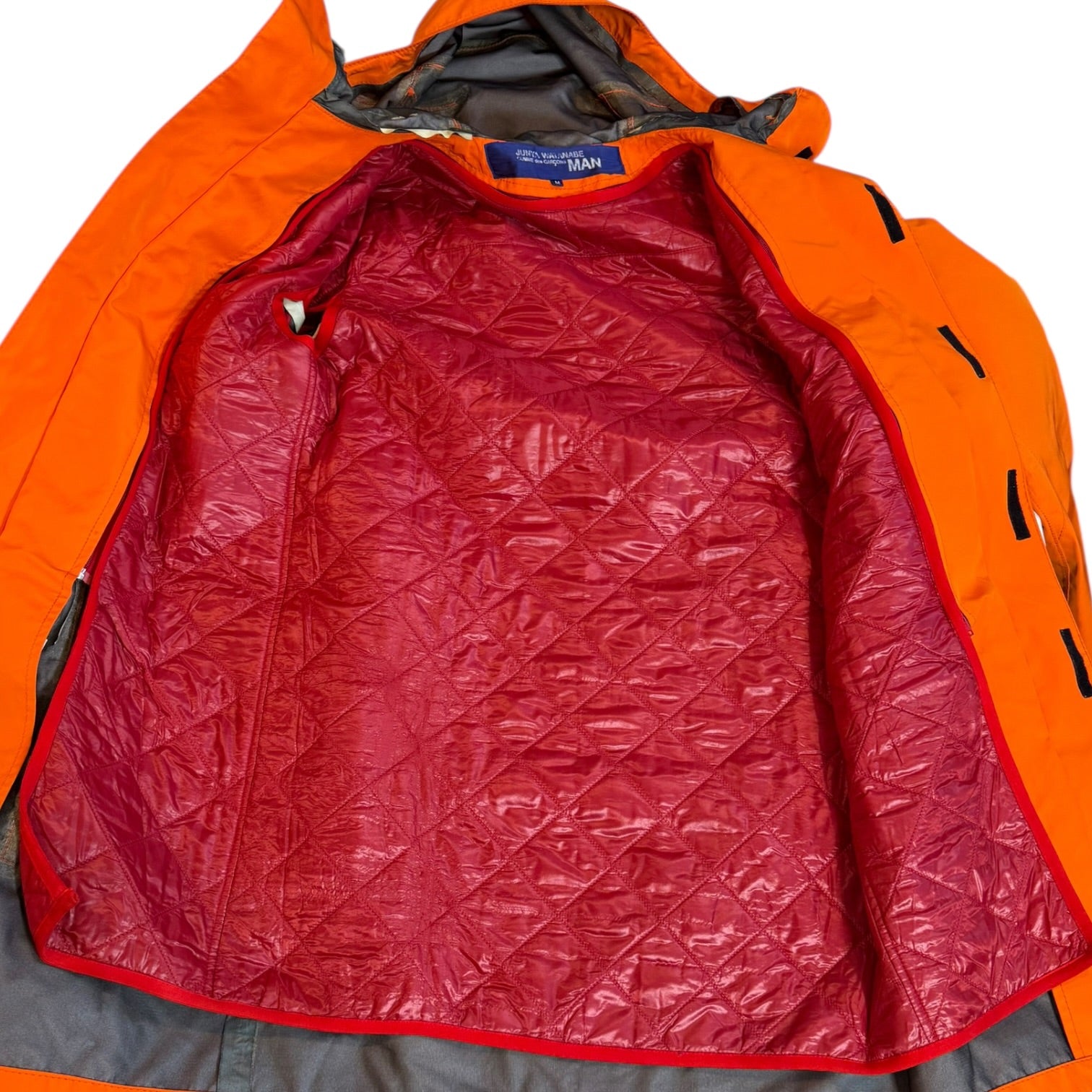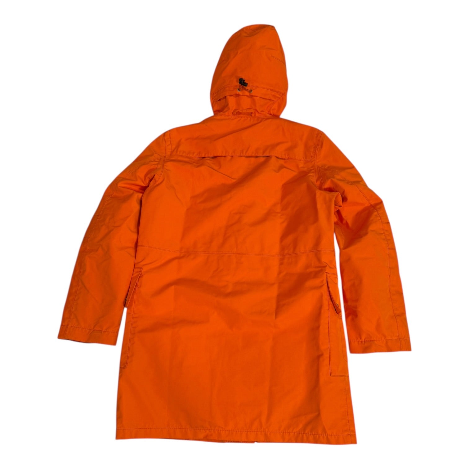 Junya Autumn 2005 Runway Goretex Toggle Parka in Orange, tagged size M measures 22 pit to pit 17.5 shoulders 24 sleeves 34 length. Quilted zip out liner with 3 vents for comfort, as well as adjustable snaps and elastic drawcords. In good condition for age, some seam taping behind the removable liner and near the hood is coming up but still waterproof and not visible when worn. See last photo for appearance on runway.