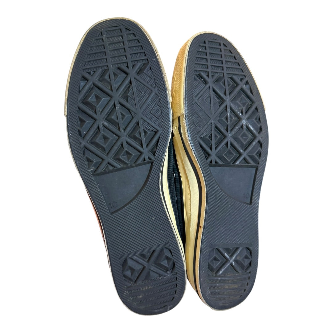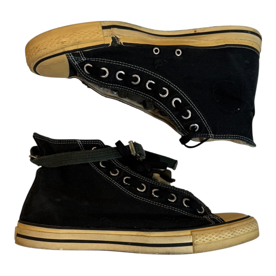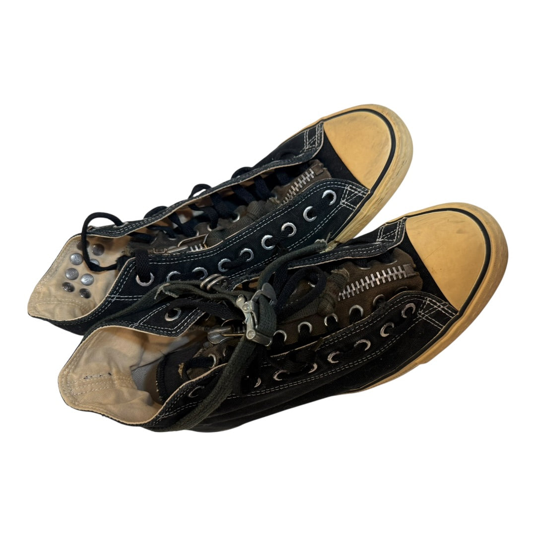 Undercover x Takahiro Miyashita Studded Rebuilt Converse in Black, (needs sole swap, see below) size L fits US9.5-10. This collaborative project between Jun Takahashi and Takahiro Miyashita is from late 2009, shortly after the latters departure from Number (N)ine. The pair destroyed and rebuilt ‘Converse’ style trainers in the style of Undercover’s iconic Spring 2006 Studded Boot, using repurposed milsurp zippers and straps with heavy metal hardware and studding. In unworn condition, this pair has been in storage for almost 20 years and as a result the soles have hardened, necessitating a sole swap before they can be wearable again.
