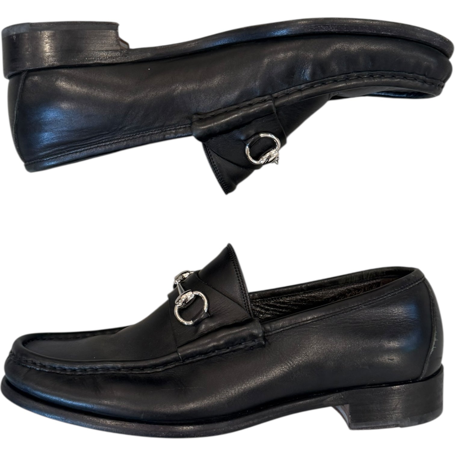 Gucci Horsebit Loafer in Black Calfskin with Silver Metal Horsebit Accent. Tagged Size 9.5 runs slightly large, fit US9.5-10.5. Great condition with no flaws except wear to soles visible in last photo.