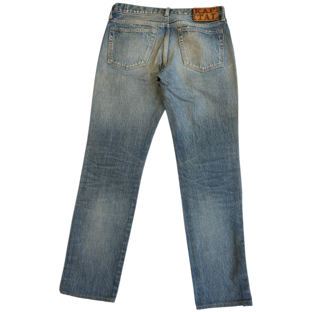 Kapital Stone Wash Indigo Denim, Light Blue, tagged size 30 measures 30.5 waist 11.5 front rise 14 back rise 28.5 inseam 7.25 leg opening. In good used condition, no noticeable flaws.