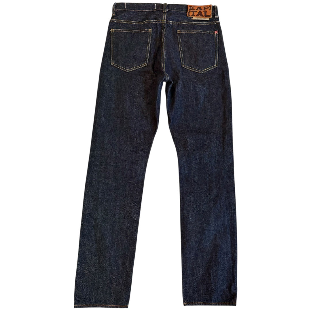 Kapital Indigo Denim, two-tone contrast thread at waist, single flower rivet at rear pocket, tagged size 29 measures 29.5 waist 11.5 rise 13.75 back rise 28.5 inseam 7 leg opening. In good used condition with no noticeable flaws.