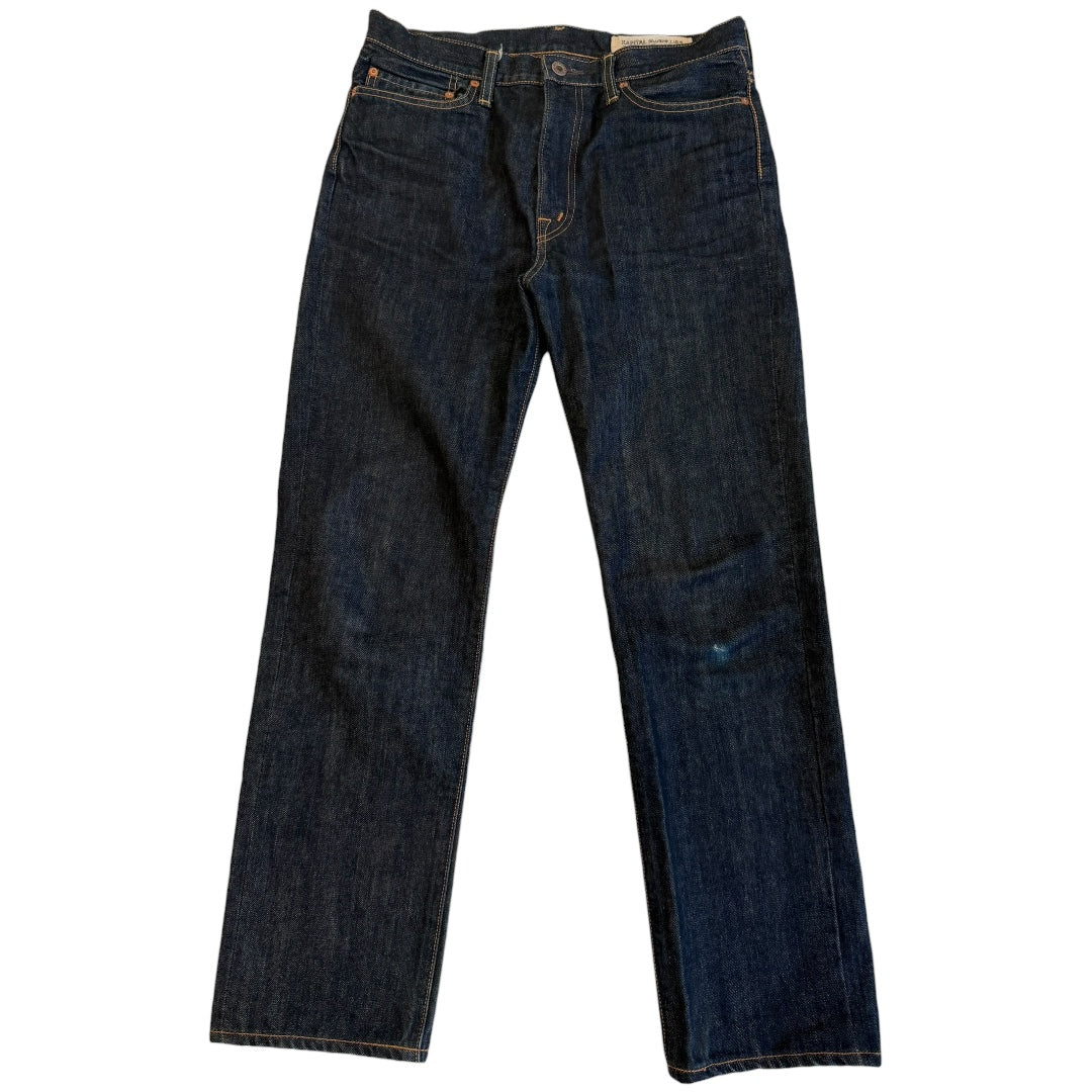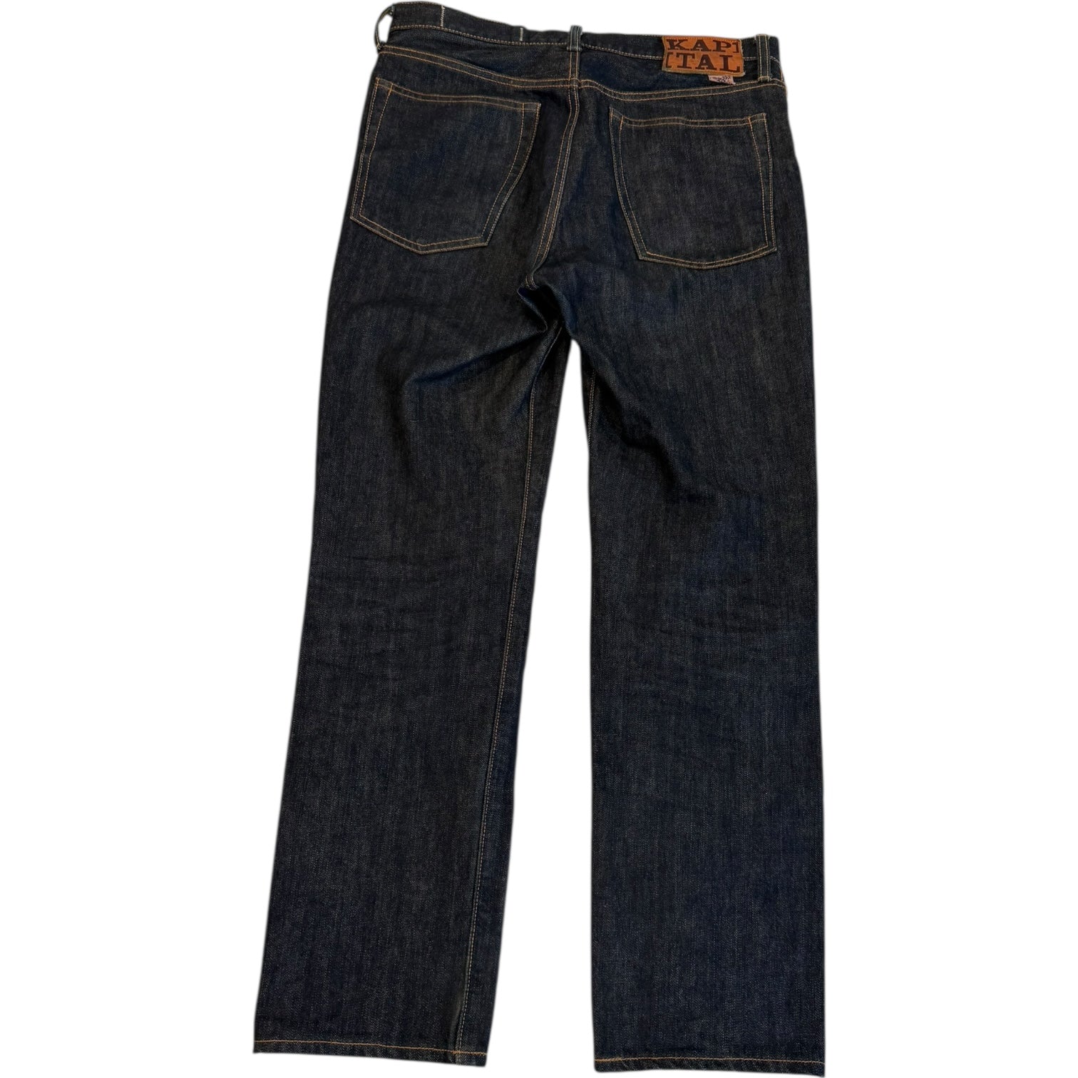 Kapital Indigo Denim, tagged size 34 measures 32.25 waist 12 front rise 14.5 back rise 28.76 inseam 7.5 leg opening. In good condition with one blemish on front knee.