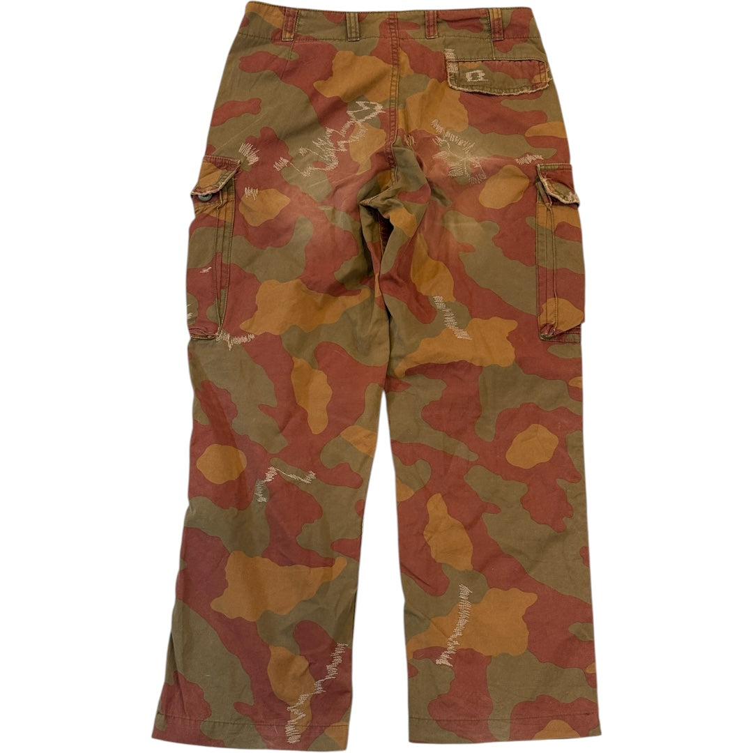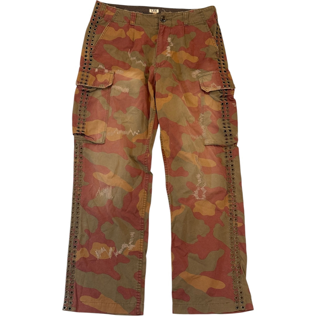 LGB Distressed Embroidered and Repaired Riveted Side Line Cargo Pants in Orange / Brown / Pale Green Camo. Tag size 29 fits waits 31 rise 11.25 back rise 13.5 inseam 28.75 leg opening 8.75. In incredible used condition with no flaws.