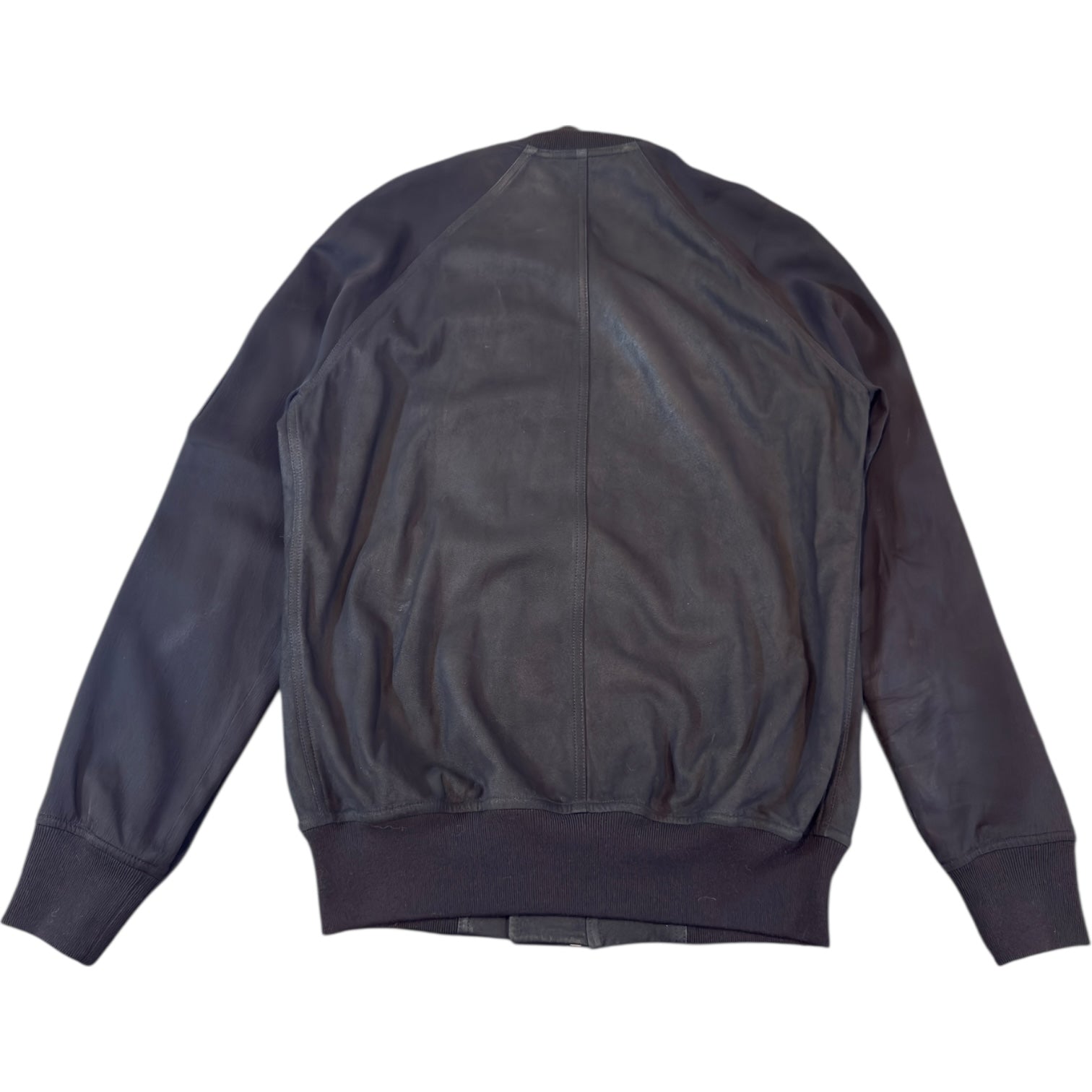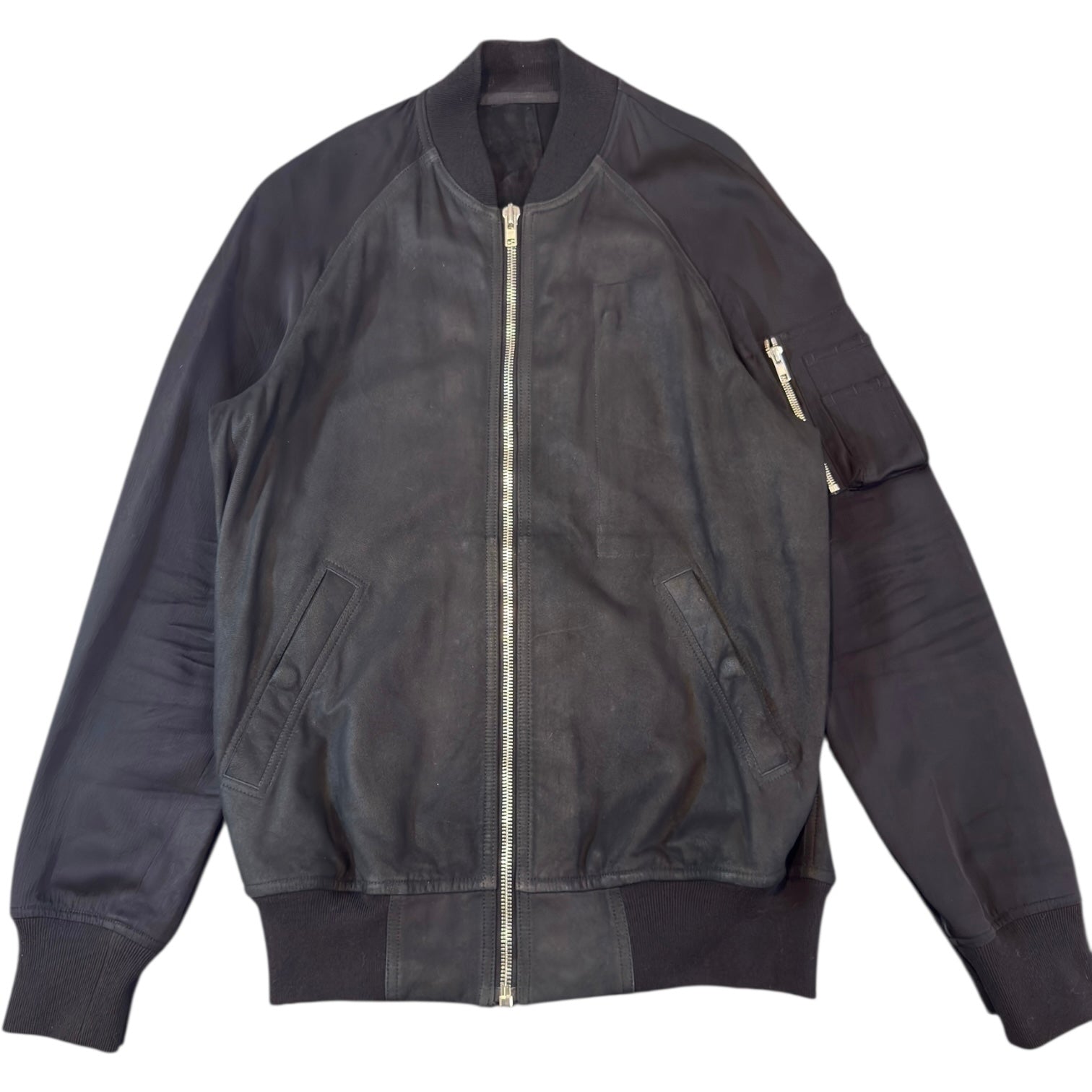 Rick Owens Spring 2016 Lambskin Raglan MA-1 Hybrid Bomber Jacket in Black, tag size 50 / Large fits true to size. Measures 21.5 pit to pit 33 sleeves to neck 27.75 length. In good used condition with some minor signs of wear on acetate blend sleeves. Natural rough-out suede interior with finished seams and hidden pocket.