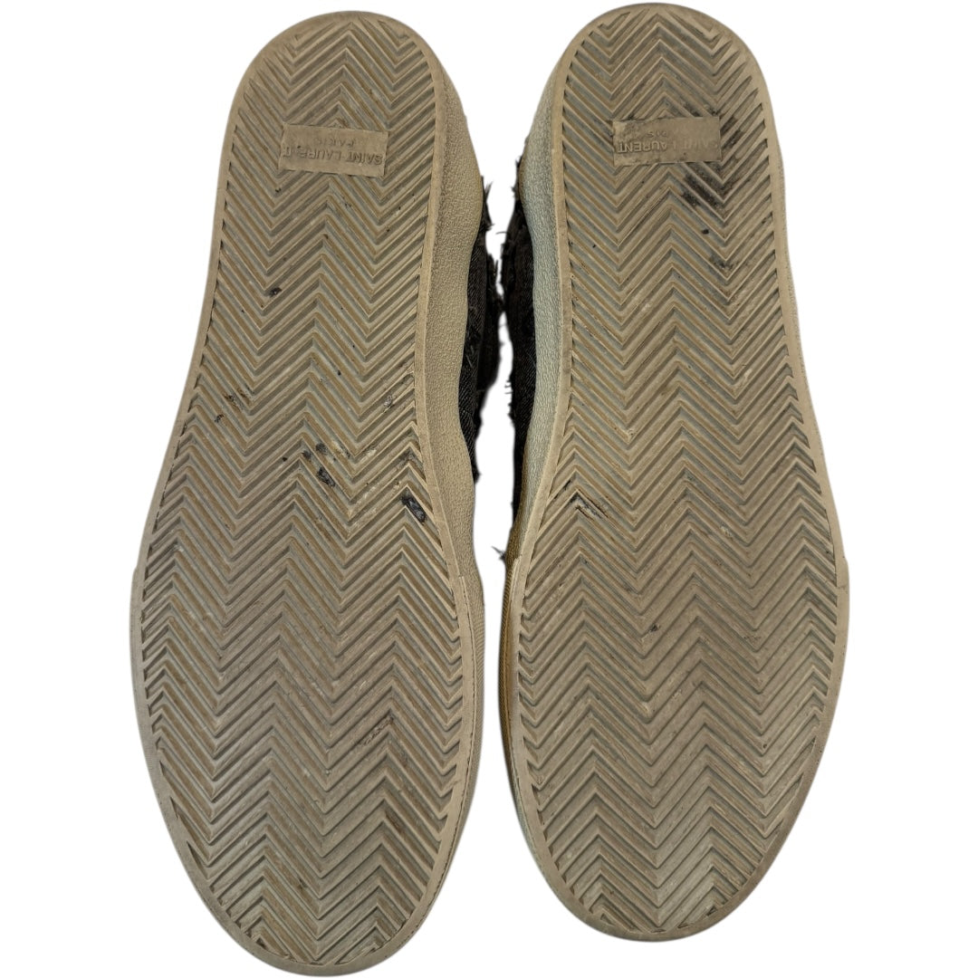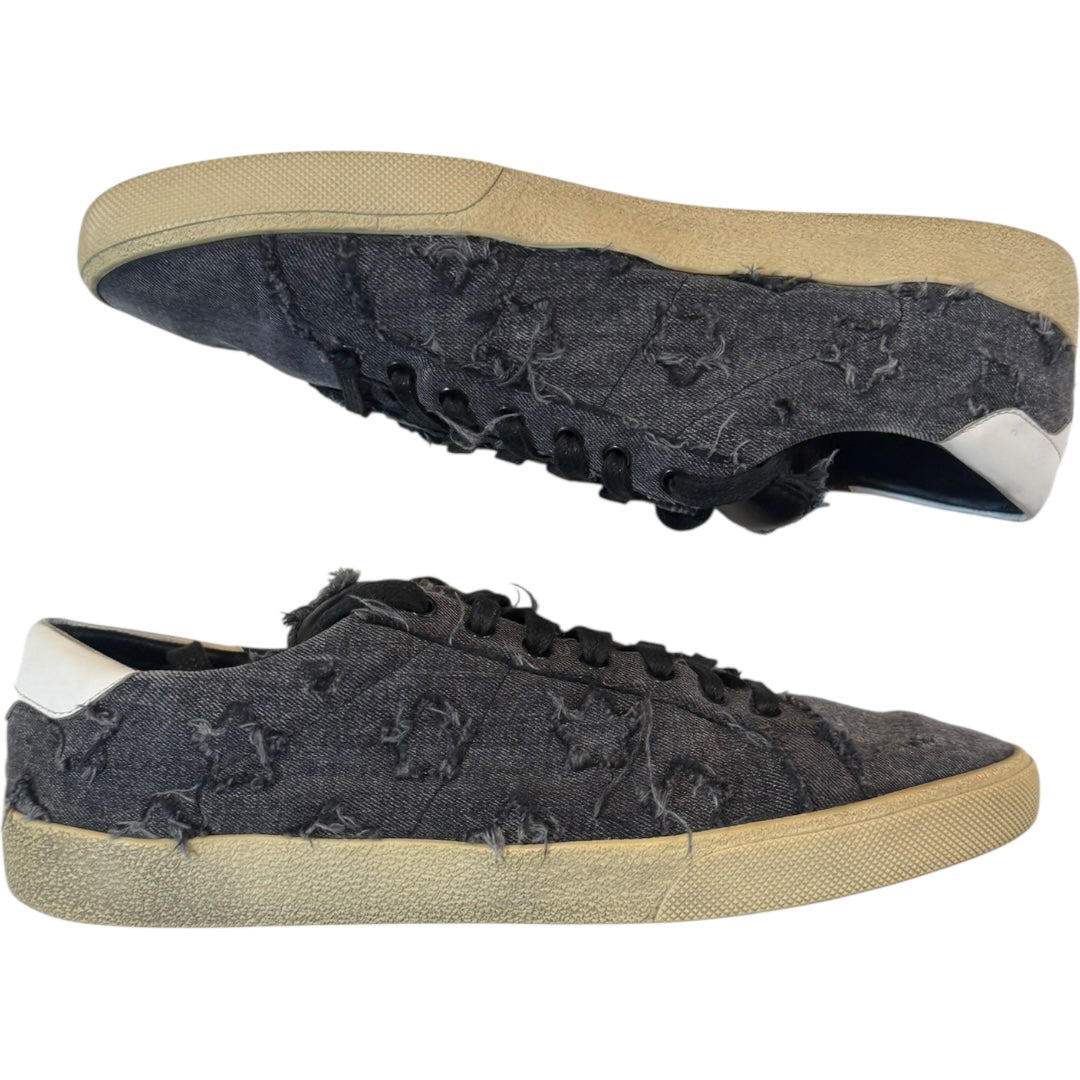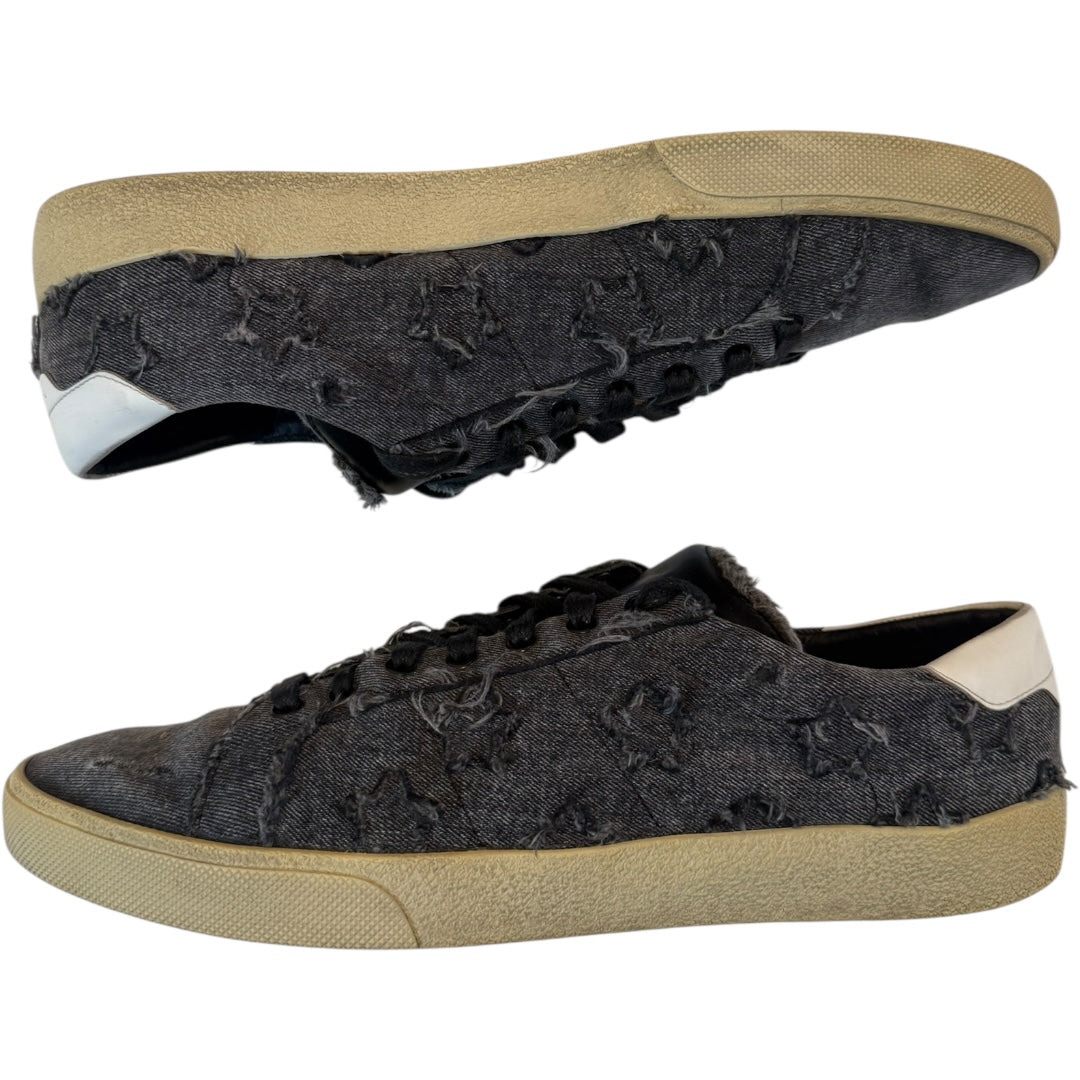 Saint Laurent Distressed Denim Low-Top Star Sneakers in Black/ Grey, tag size 46 / US13 fits US12.5-13. In good condition with all wear shown in photos.