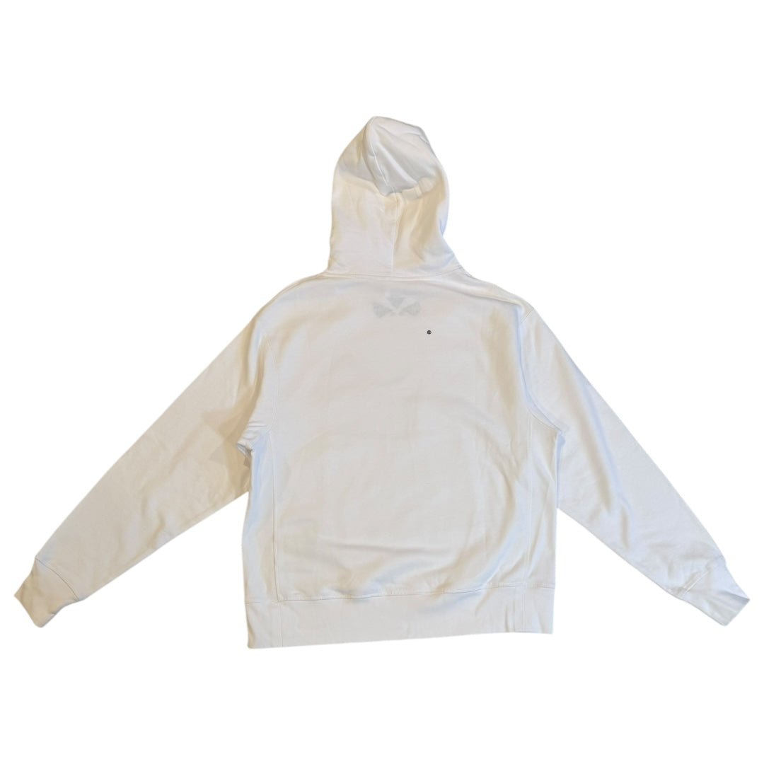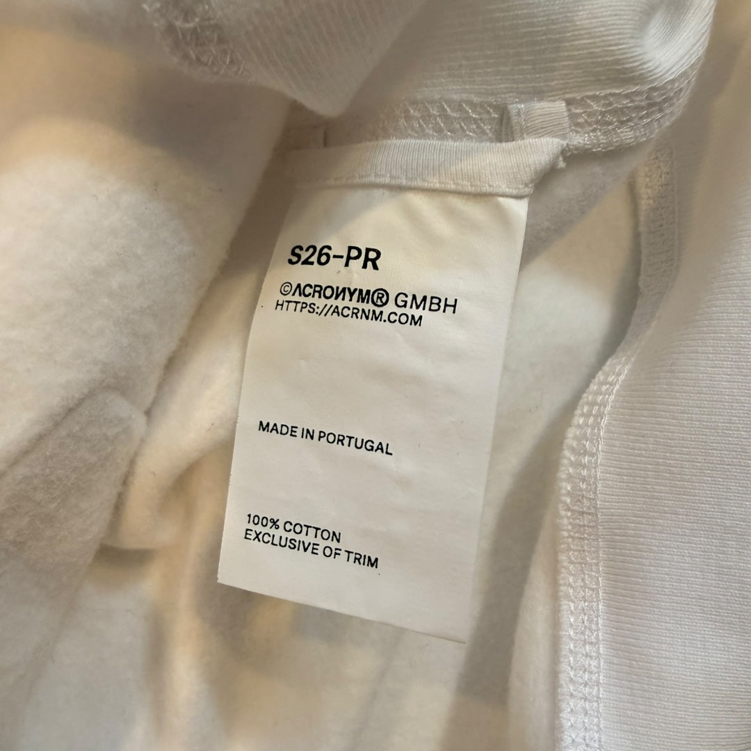Acronym S26-PR Layered Cotton Hoodie in White tagged size XS measures 18 shoulders 21 pit to pit 25.5 length 25.5 sleeves. Two available, both new in packaging, one missing spec sheet. Both have SSENSE tags.