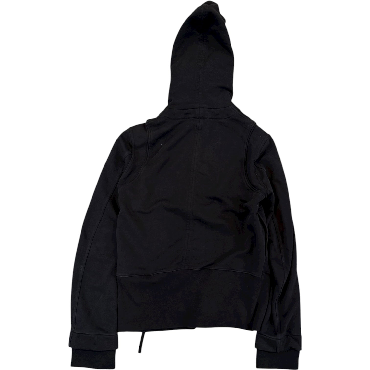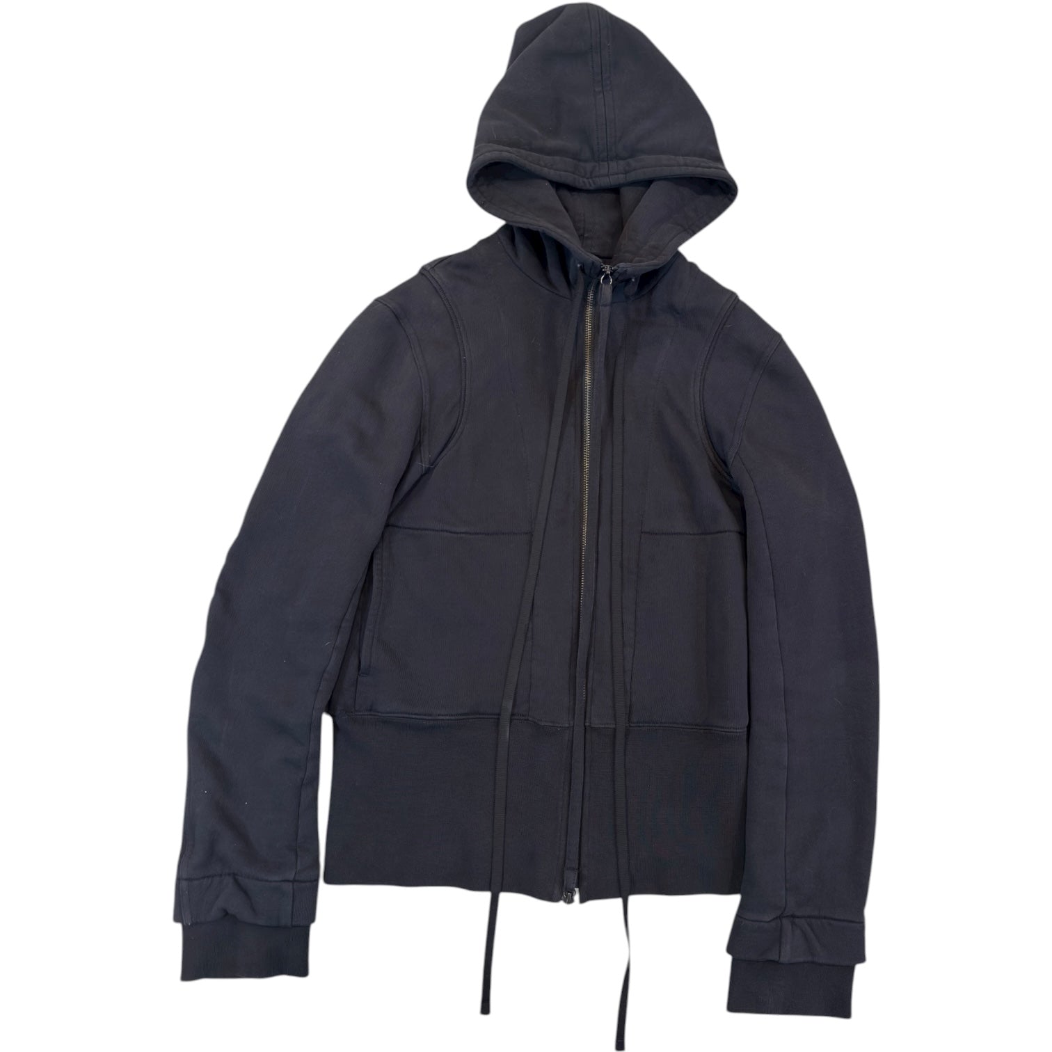 Ann Demeulemeester Scuba Neck Double Zip Hoodie. This recent Ann Demeulemeester piece uses her iconic bondage straps in an entirely new context, creating a layered, corded double zip hoodie with each zip attached to the other. Beautiful French Terry with an exceptionally designed articulated fit made possible by layering and panelling the French Terry body. in 9/10 condition with one running stitch at back left shoulder, not noticeable when worn or in photos. Tagged size XS, fits S-M measures 18.75 pit to pit 16 shoulders 26 sleeves 25.5 length