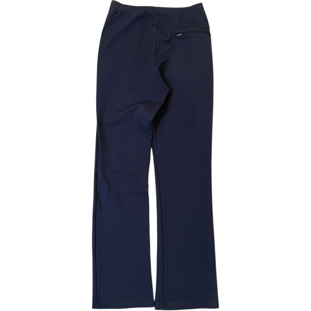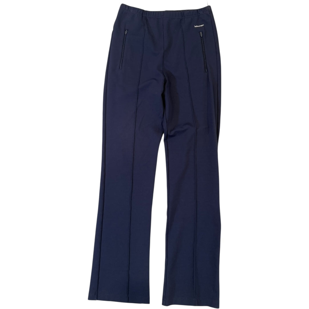 Balenciaga SS2017 Rayon Bootcut Track Pants in Dark Blue, tagged L measures 27-34 waist 12.75 front rise 14.5 back rise 30.5 inseam 8 leg opening. In great condition with minor wear to logo print, no other flaws.