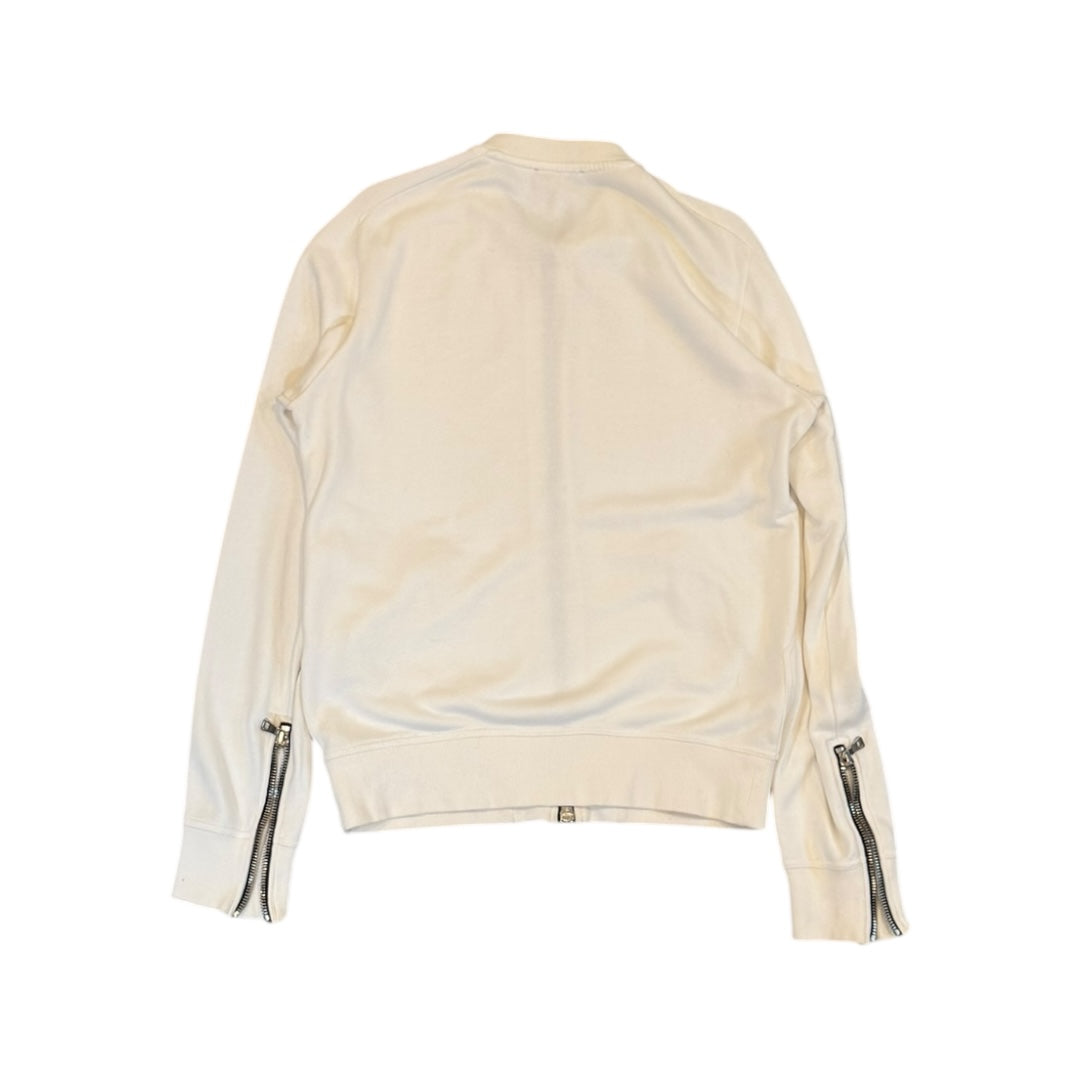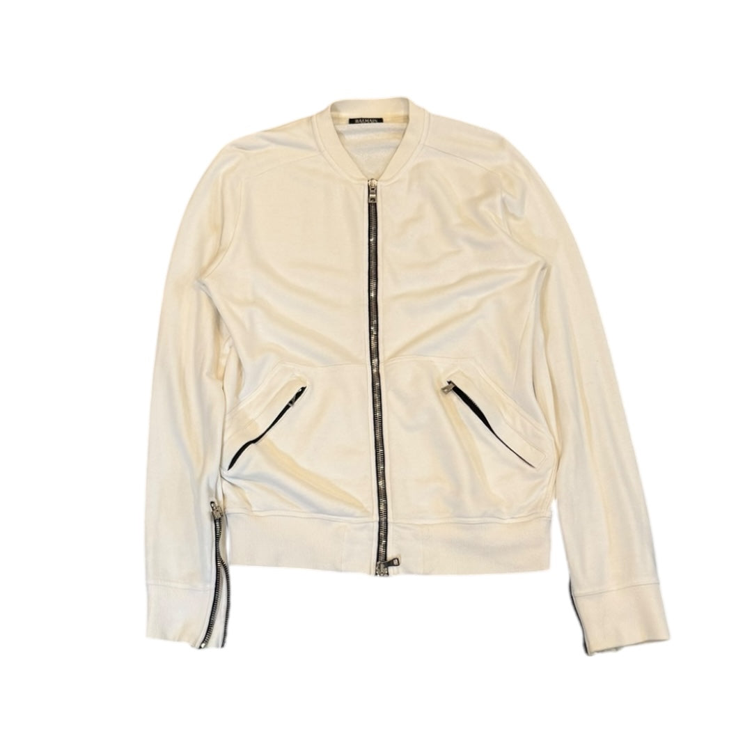 Balmain by Christophe Decarnin Spring 2011 French-Terry Double Zip Raglan Bomber tagged size M measures 21 pit to pit 32.5 sleeve to neck 27.75 length. This garment features Balmain’s signature heavyweight Lampo zippers on a springy white French Terry cotton with raglan cut shoulders and adjustable wrists. In good condition for age, with some slight fading to color.