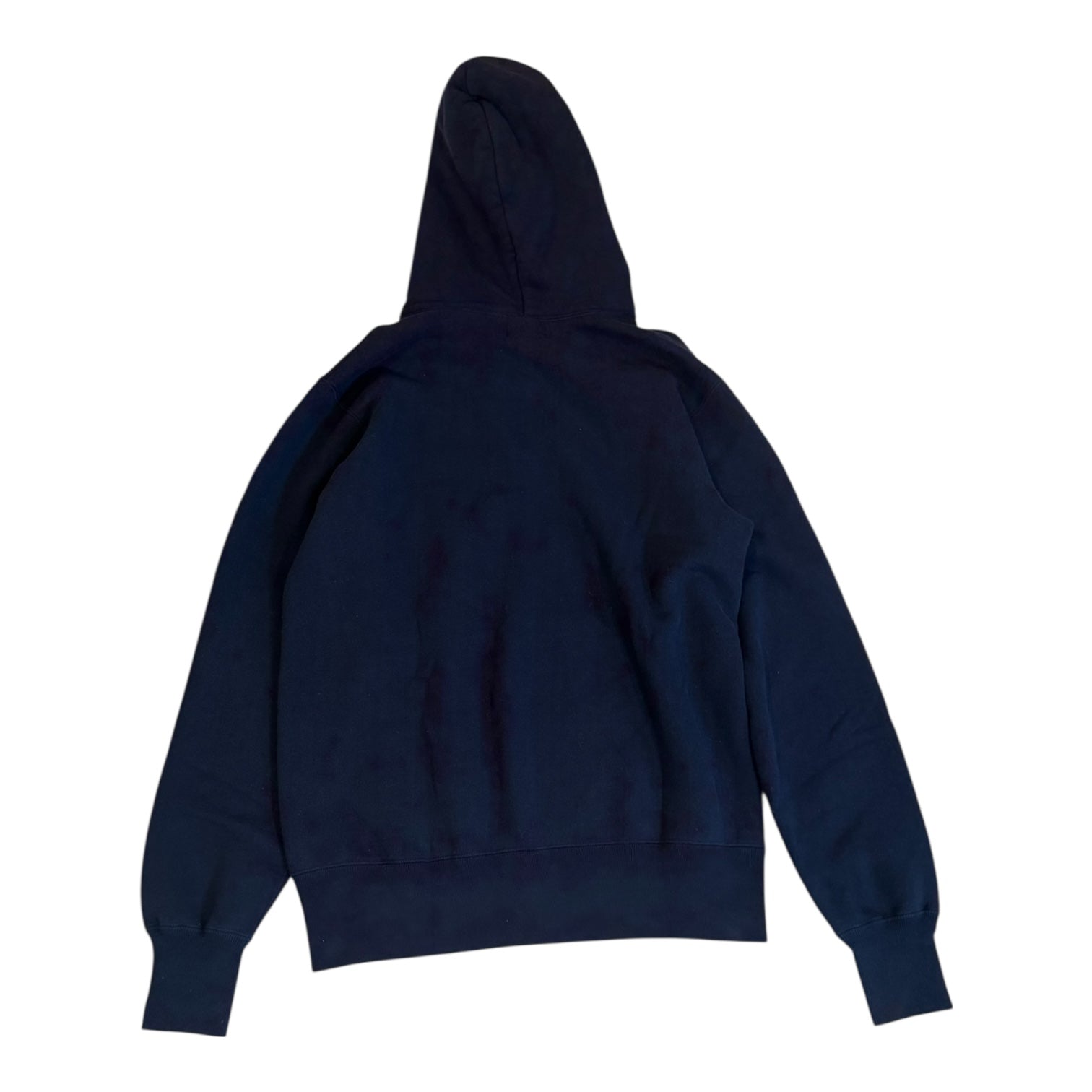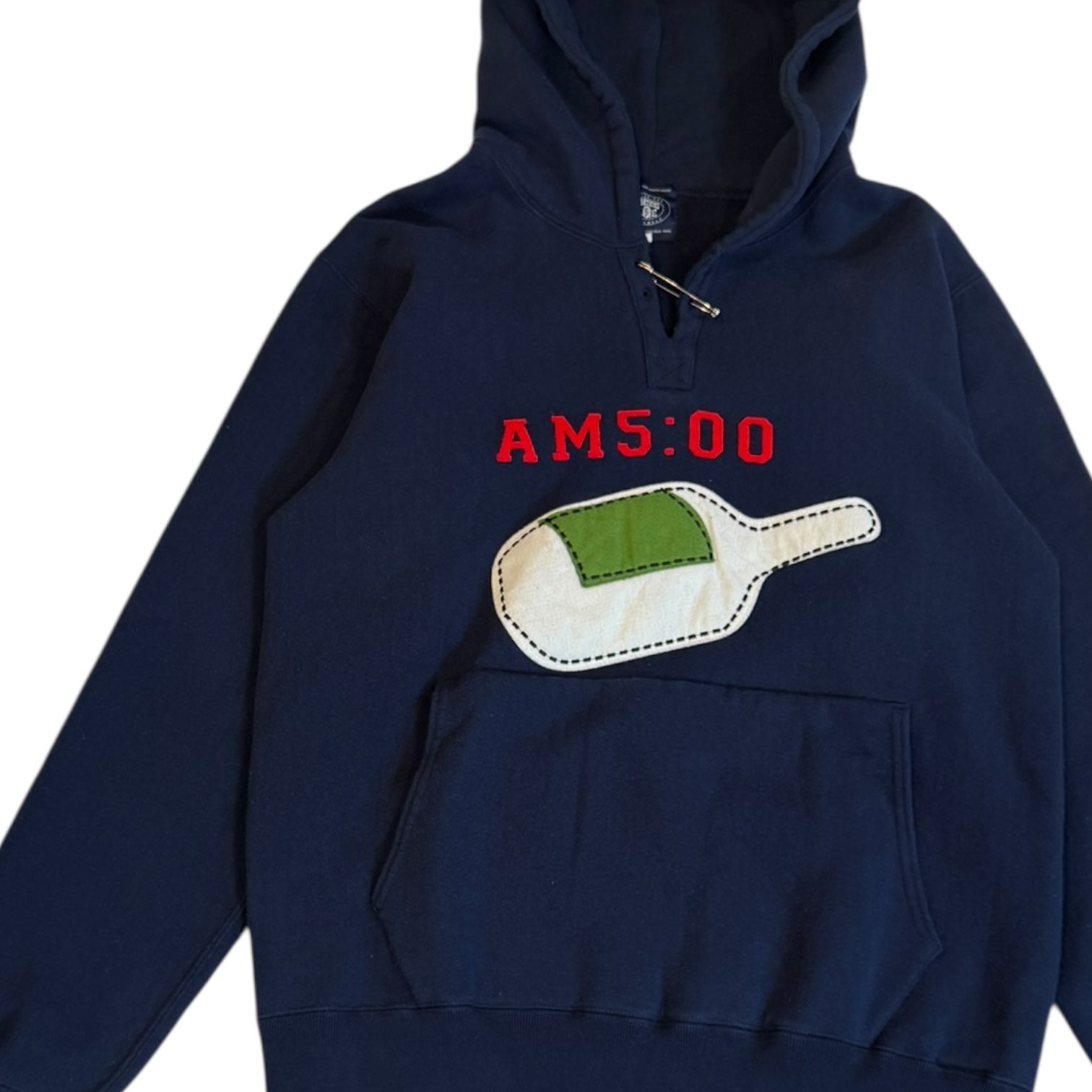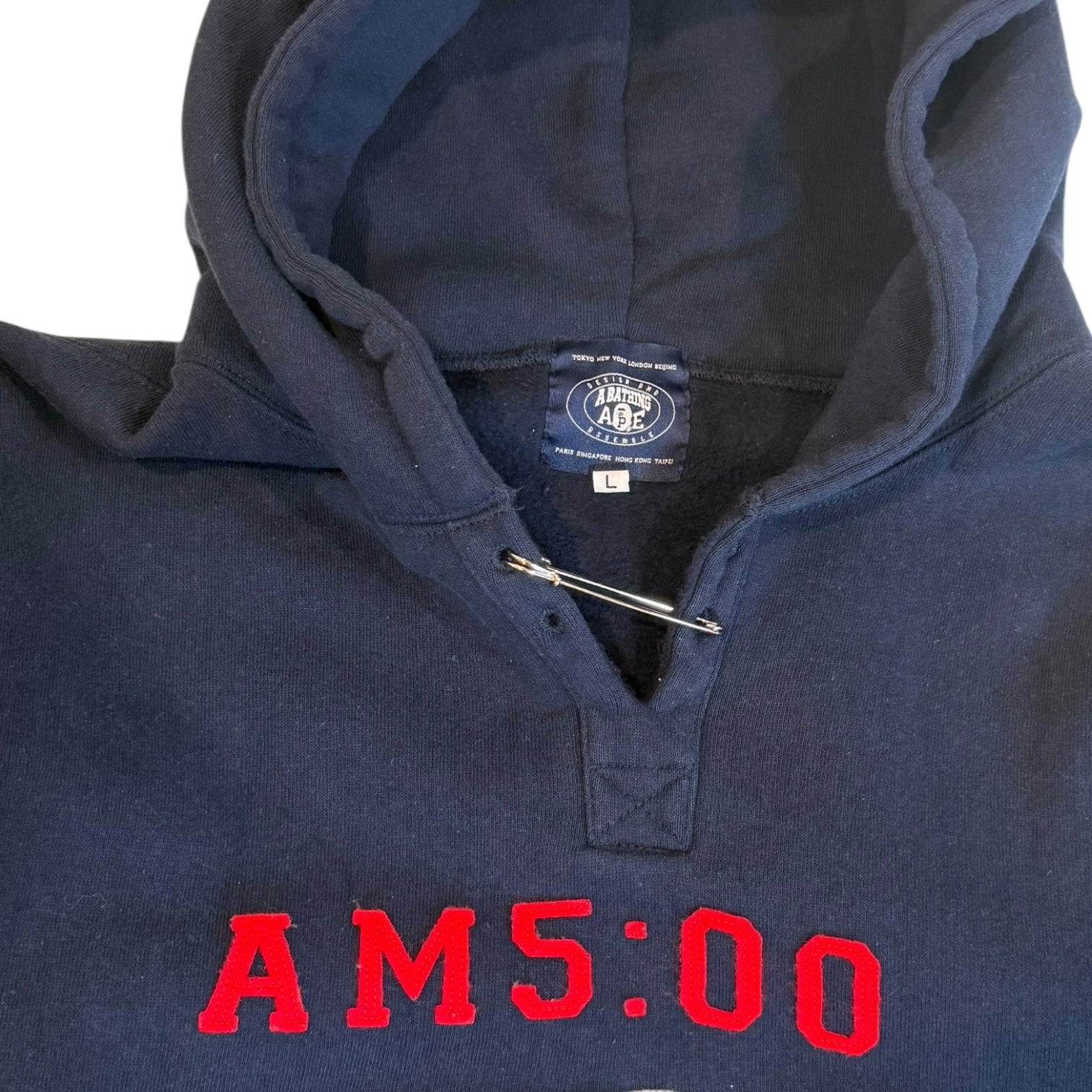 Autumn 2011 Bape x Sk8thing ‘AM 5:00’ Felt Patched Safety Pin Hoodie in Blue, tagged size L measures 20.75 pit to pit 19.25 shoulders 26.5 sleeves 27 length. In exceptional condition with no noticeable flaws