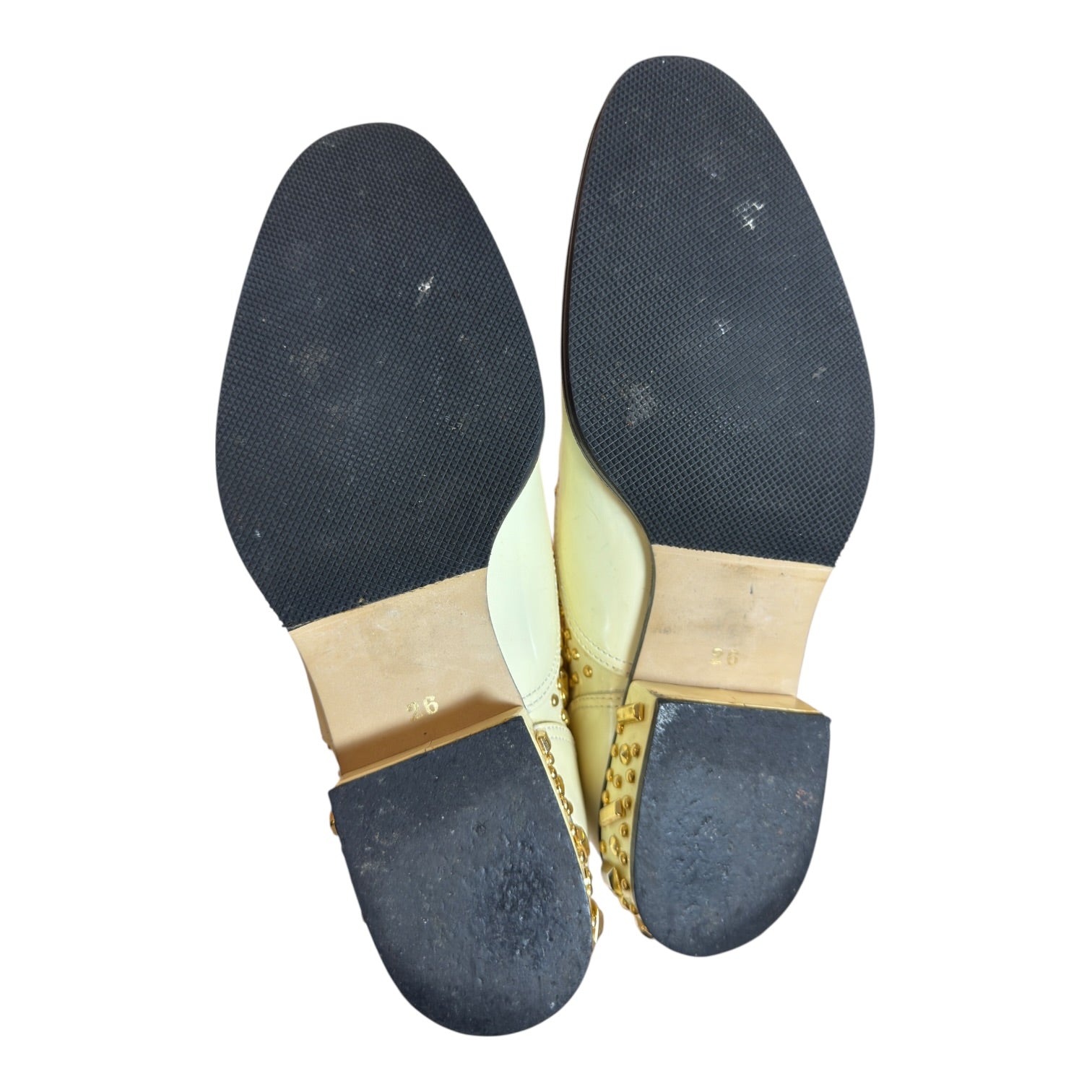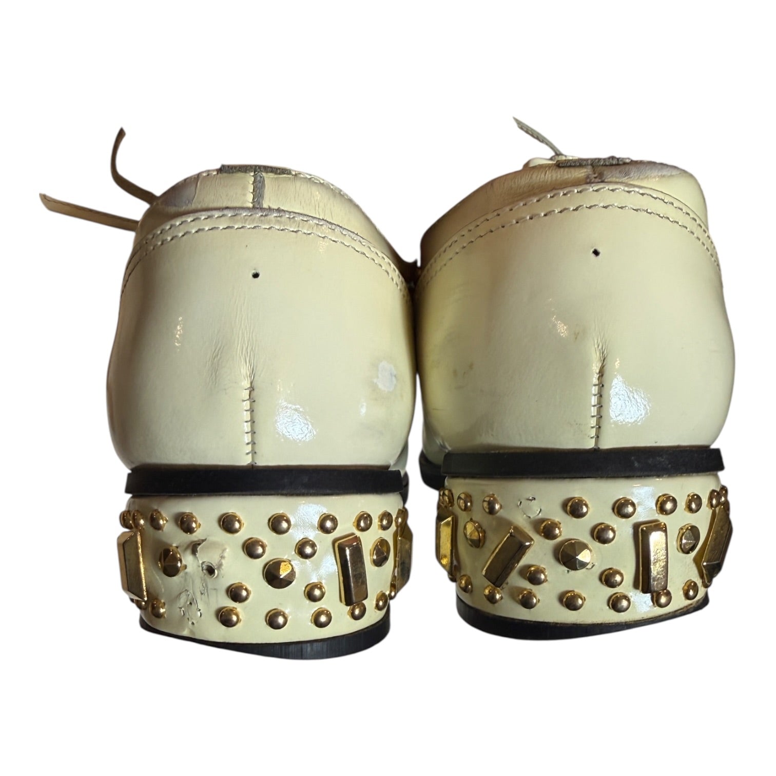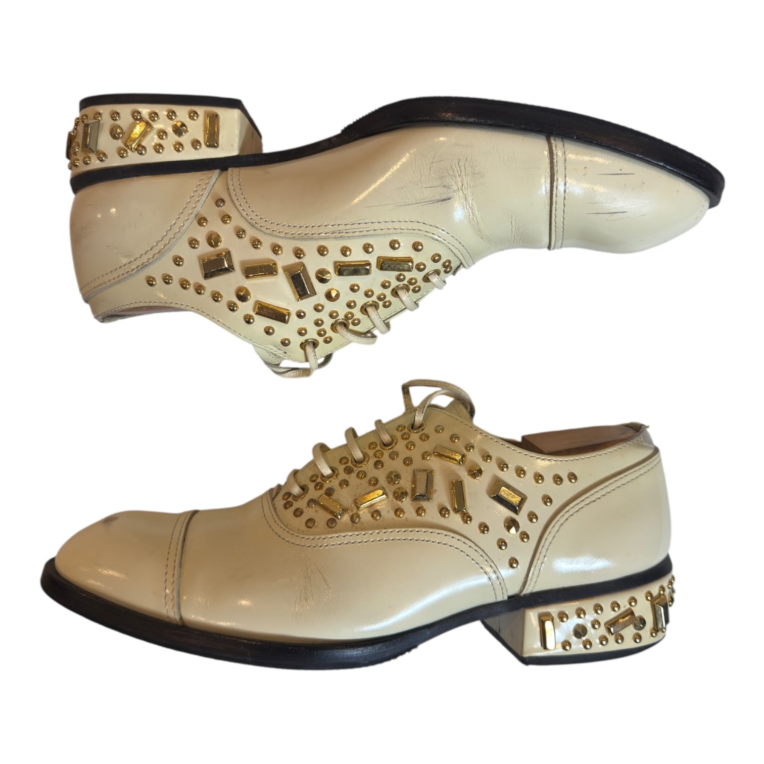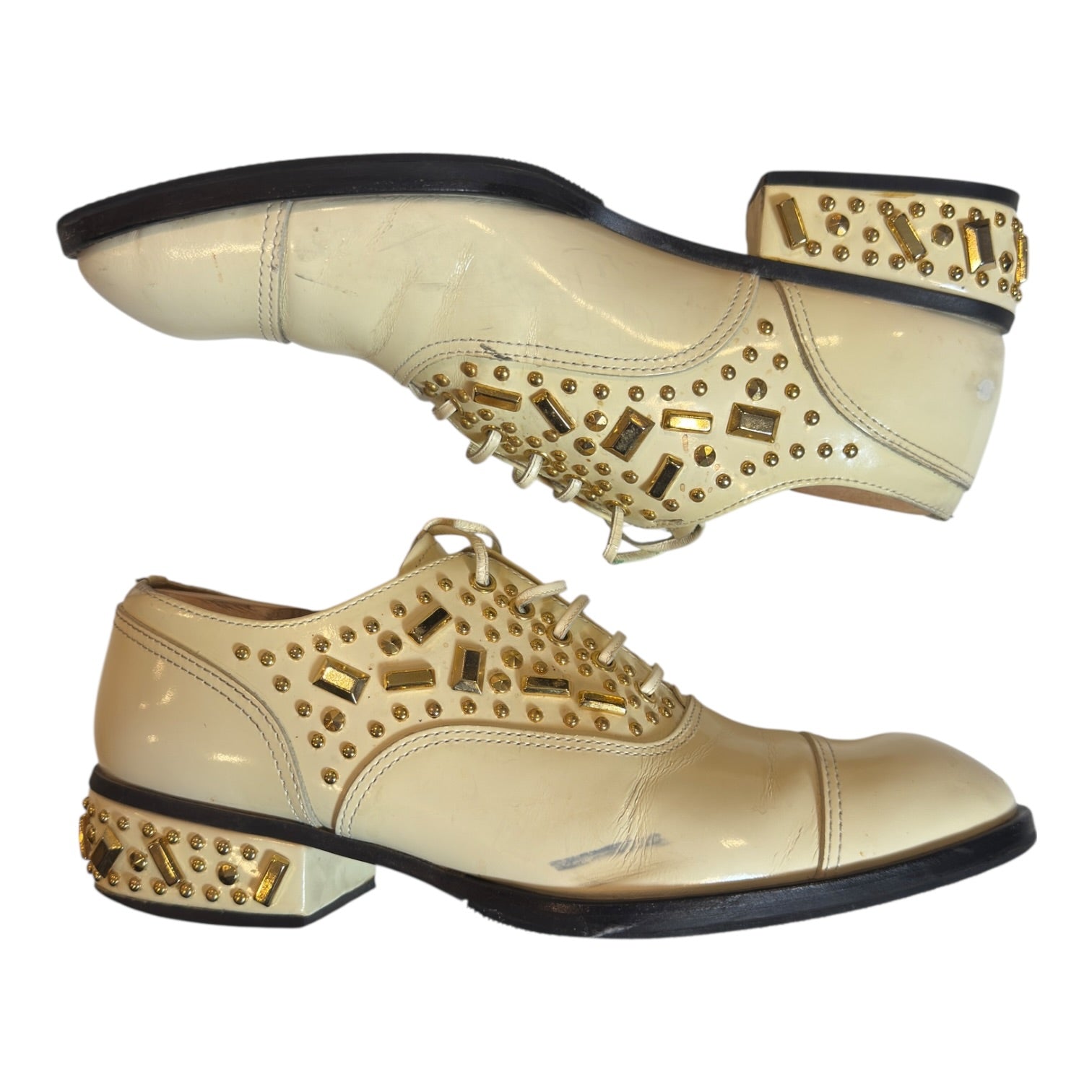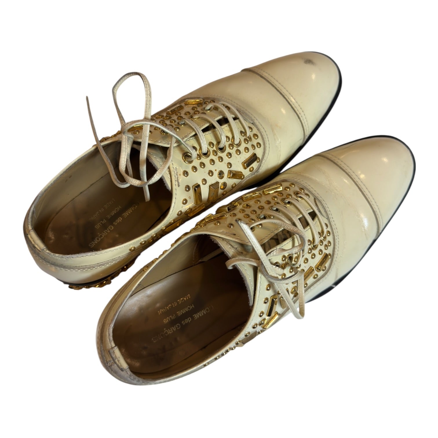 Comme des Garçons Homme Plus Spring 2007 ‘Golden Boy’ Studded Derbies tagged size 26 / US8 runs large, best for US8.5-9.5. In reasonable used condition with one stud missing at heel and discoloration to white polished leather, visible in photos.