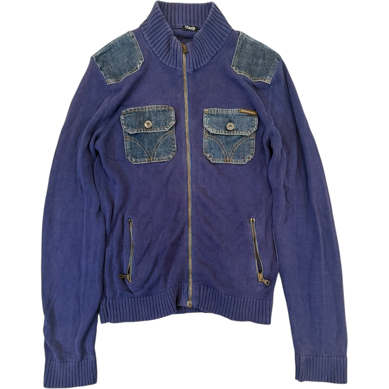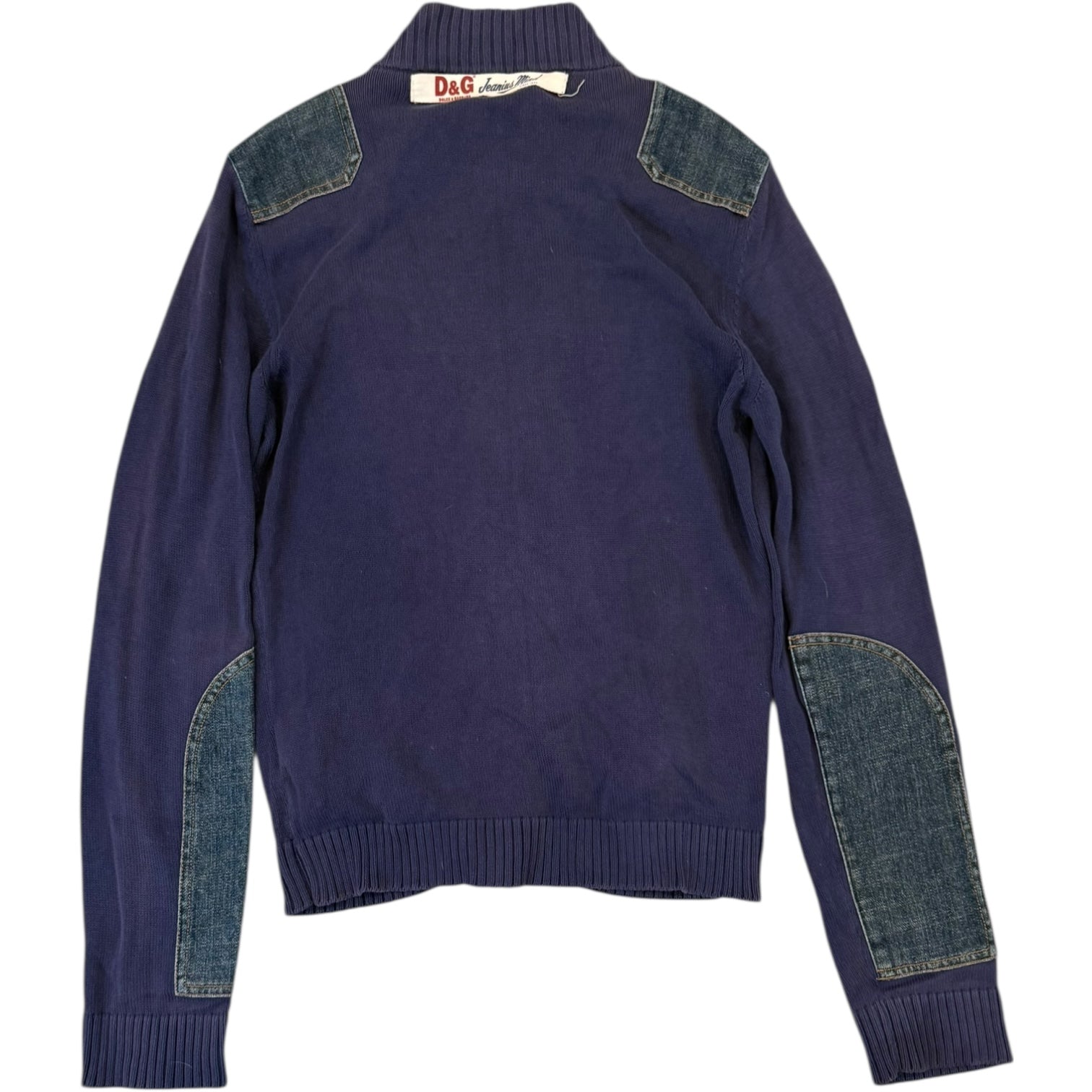 D&G Dolce & Gabbana Knit Hybrid Panelled Jacket. Features D&G branded Raccagni zippers on an extremely comfortable loose knit with military inspired patch placement in indigo denim. Extended sleeves on a cropped body. Fits M-slim L measures 19.5 pit to pit 17 shoulders 27.75 sleeves 25 length