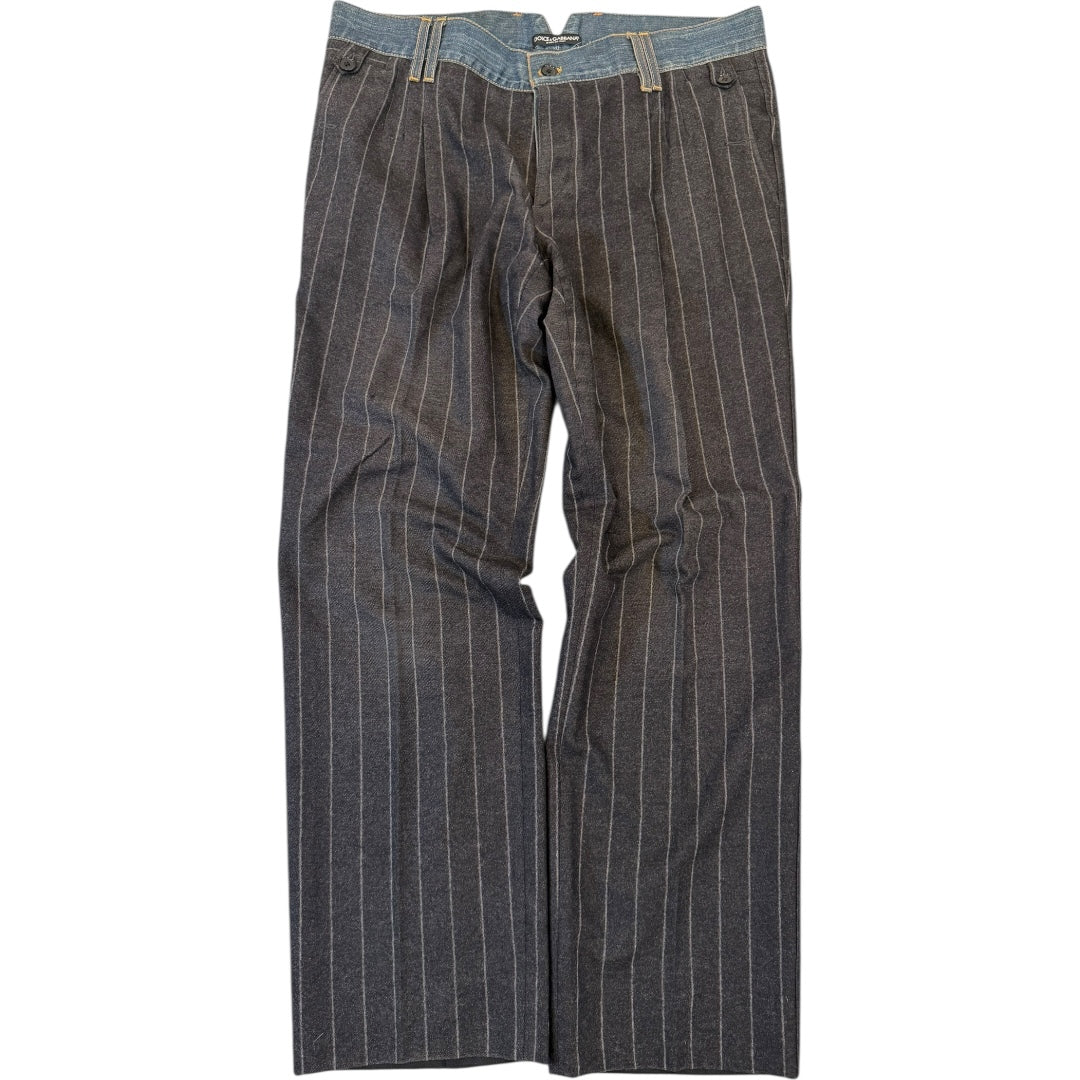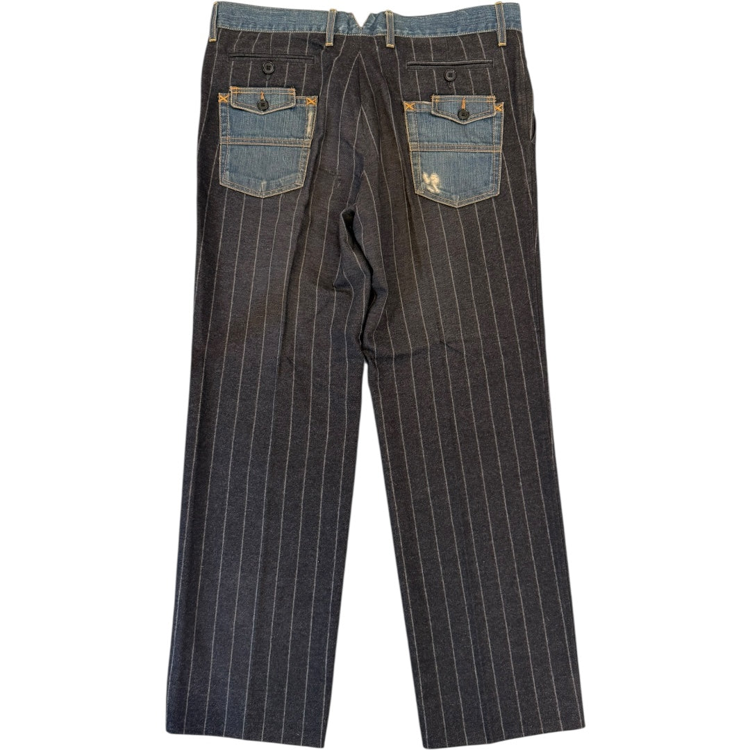D&G Dolce & Gabbana Wool Pinstripe & Denim Hybrid Pants tagged size 52 / XL measures 37 waist 12.5 front rise 14.5 back rise 32.75 inseam 9 leg opening. One repair on rear and one in crotch, no other flaws.