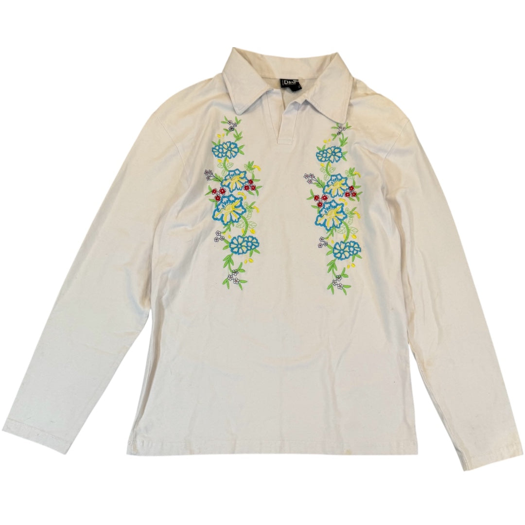 D&G Embroidered Longsleeve Collared Shirt in Cream / Off White, tag size XL fits like M-slim L measures 19.5 pit to pit 18.5 shoulders 26 sleeves 26 length. One small spot near front hem pictured and reflected in price.