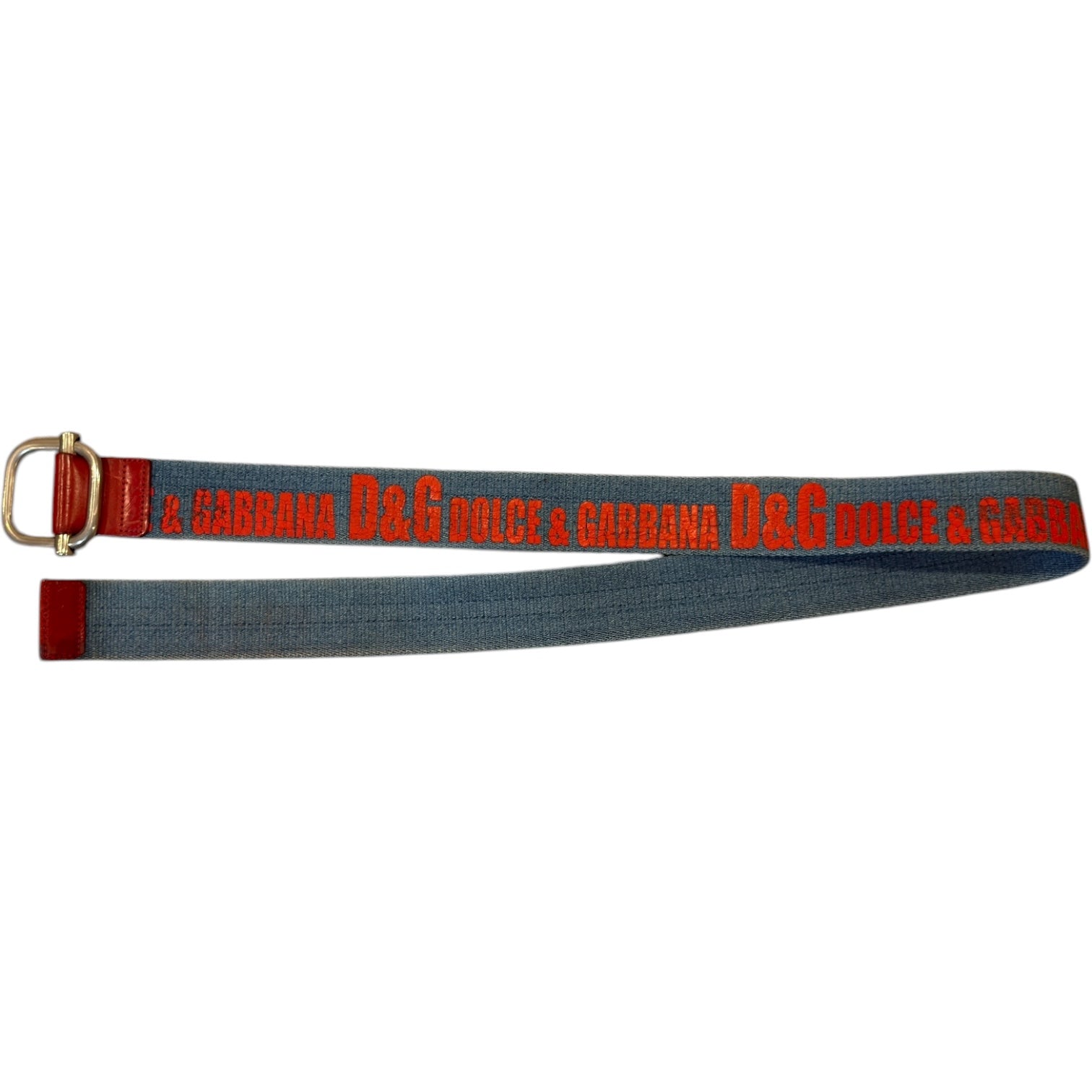 90s / early 00s D&G Dolce & Gabbana Logo Spellout Belt, One Size Fits All. Blue ballistic woven cotton with red screen printing and heavy silver metal buckle.