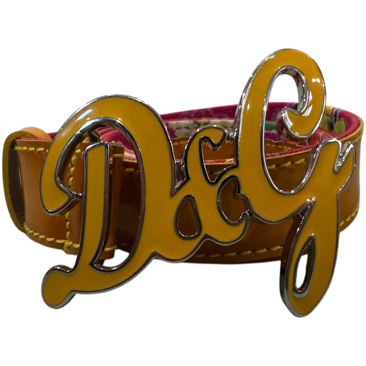 D&G Yellow Enamel Belt with Floral Lining, fits 28-32 waists. Heavyweight metal D&G logo buckle with enamel detailing and a tonal patent leather belt strap, reinforced at the button holes.