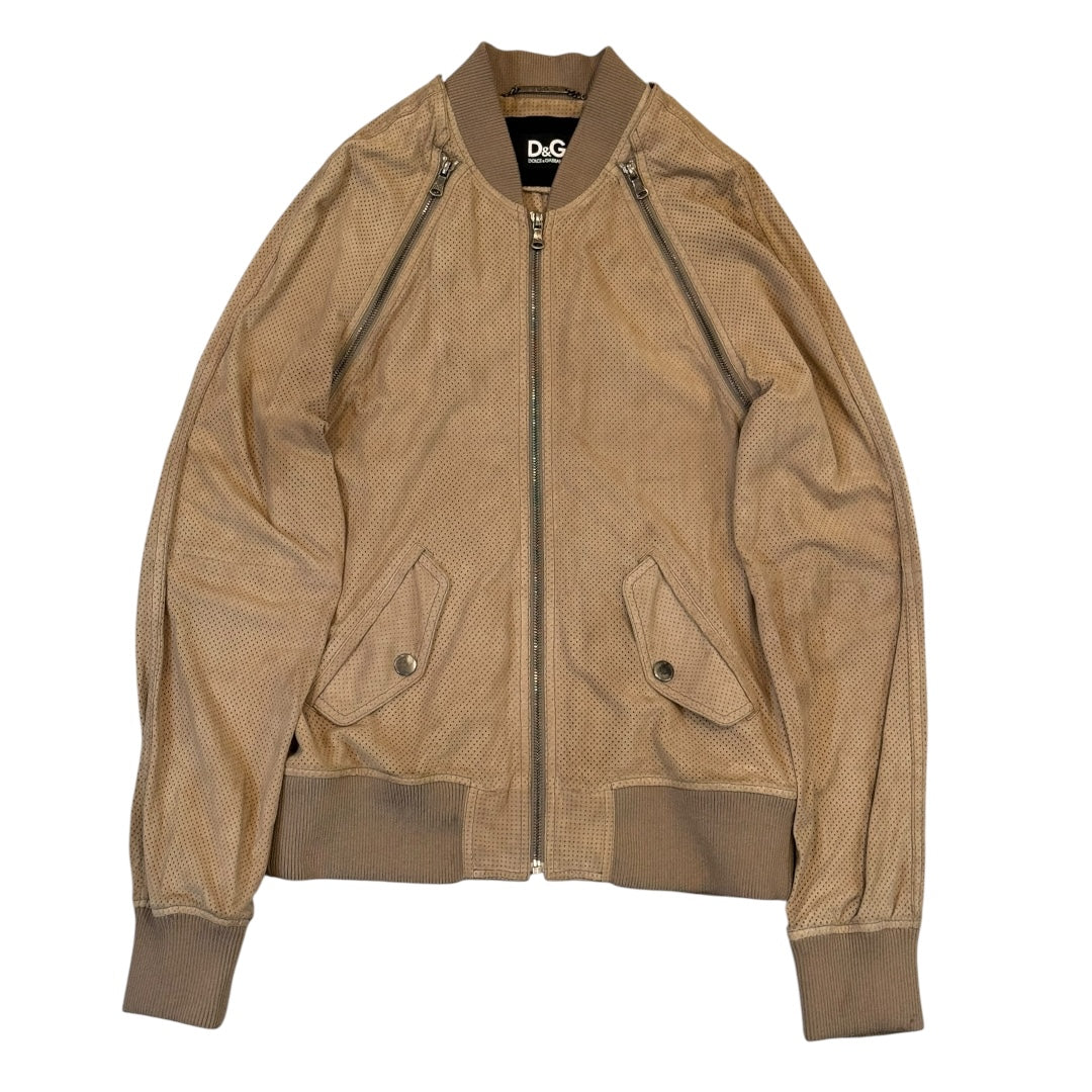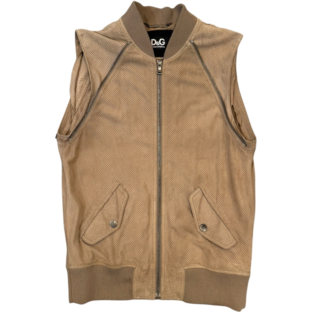 Archive D&G Perforated Lambskin Raglan Bomber Jacket with Zip-off Sleeves. Tag size 46 fits M measures 19.75 pit to pit 32 sleeves to neck 25 length. in great used condition with minor discoloration at inside neck and no other noticeable flaws.