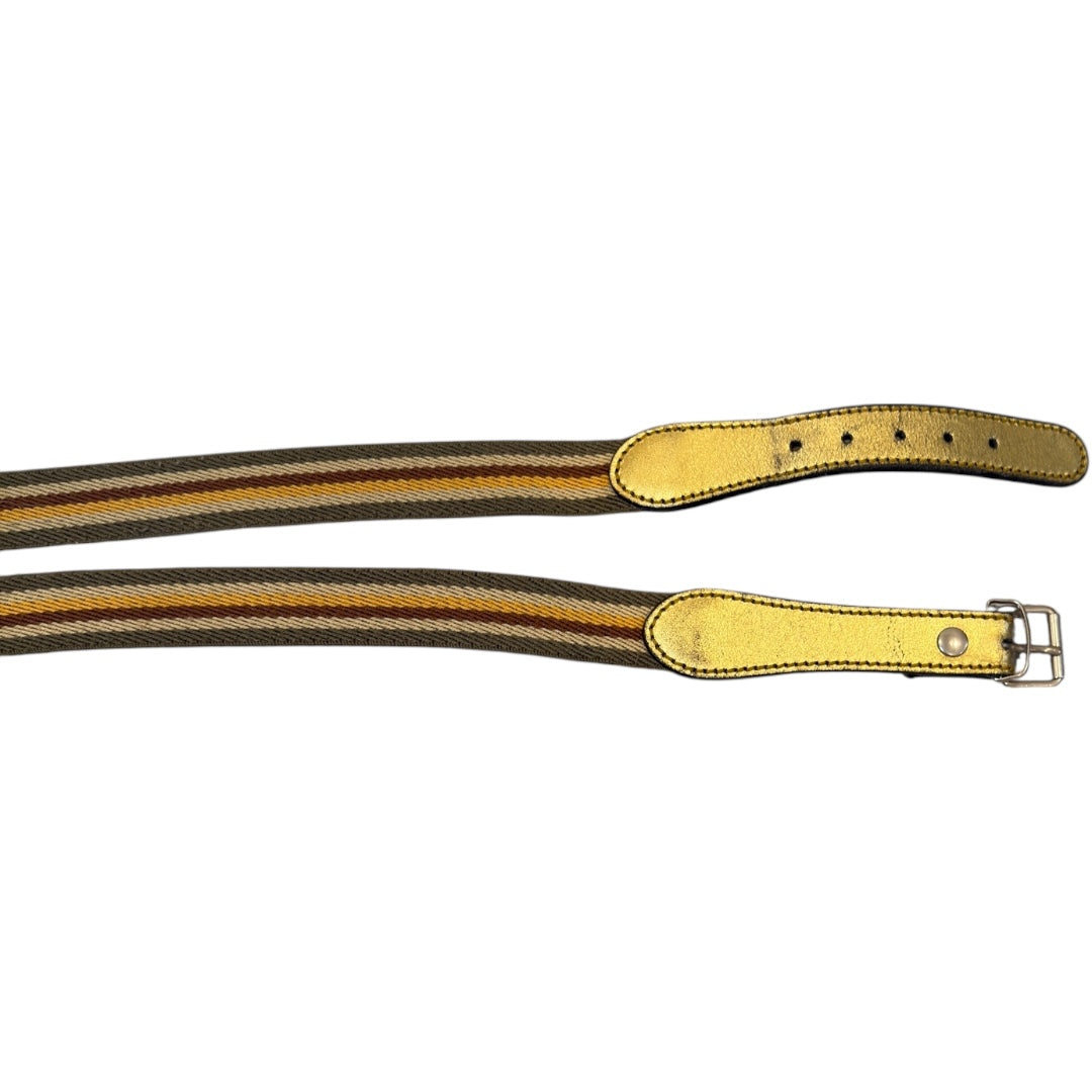 Dior Homme Spring 2005 ‘Beck’ by Hedi Slimane Gold Leather Suspender Belt. This creative design from Hedi Slimane’s Beck Hansen inspired Spring 2005 collection features an elasticated suspender for its main body, closing with a minimal buckle and two gold painted leather connections. Best for waists 33-38+ inches.