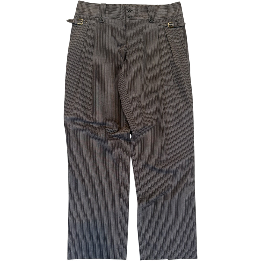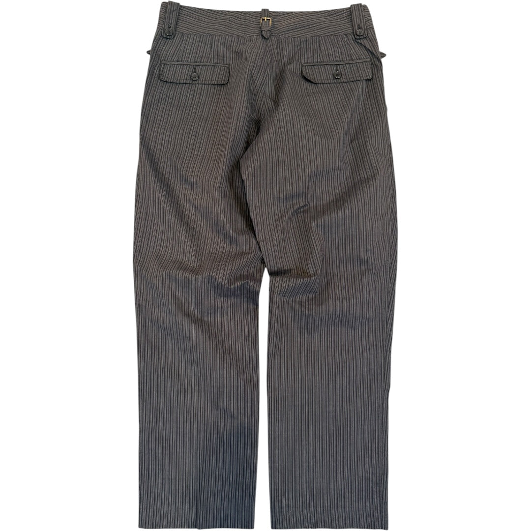 Dolce & Gabbana Grey Striped Buckled Pleated Trousers, tagged 52/XL. Waist measures 35, rise 12 back rise 14 inseam 31 leg opening 9. No flaws