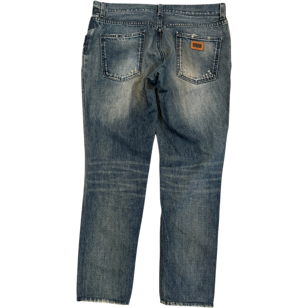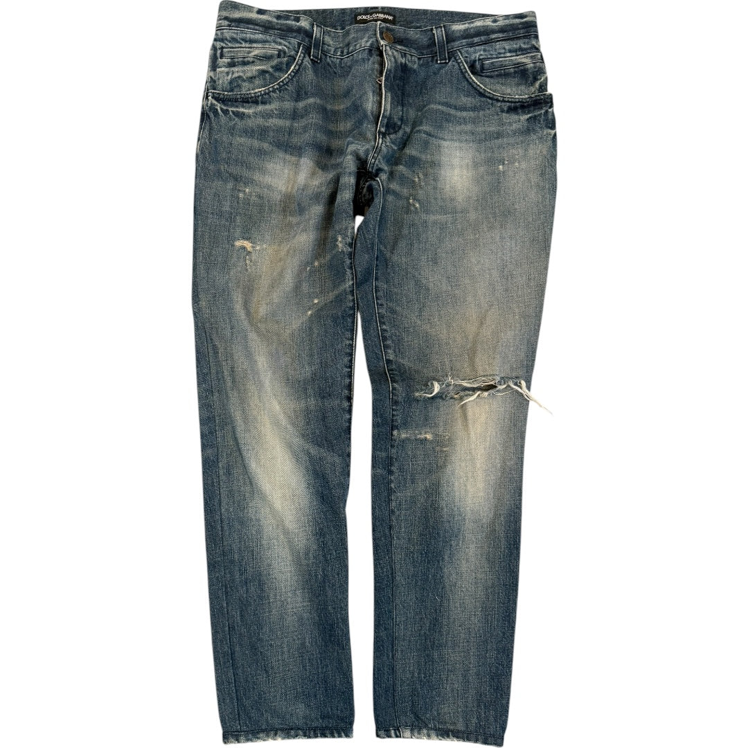 Dolce & Gabbana Low Rise Distressed Slim Denim, tagged 52/XL waist measures 35 rise 10 back rise 13 inseam 29 leg opening 6.75. In great condition, aging beautifully.
