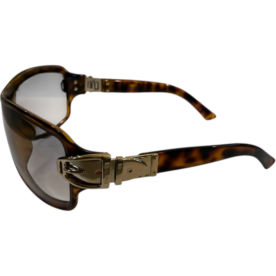 Gucci Belt Buckle Sunglasses, comes with case. Mid 00s Gucci Sunglasses with large lenses and small gold ‘belt buckle’ motif on the hinges. In good used condition with no noticeable flaws, best for smaller heads.