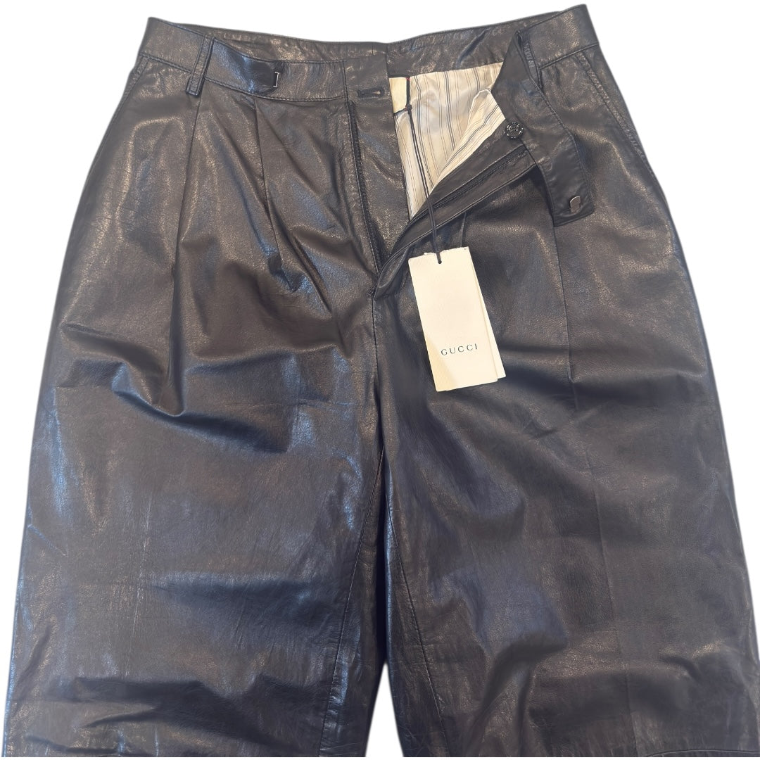 Gucci Spring 2019 by Alessandro Michele Double Pleated Calfskin Pants, Brand New With Tags, size 46 measures 30.5 waist 12.75 front rise 15 back rise 33.5 inseam 7.75 leg opening. 7/8 length cupro lining, ultra luxurious calfskin. Retailed at $5200 USD, last sold on Vestiaire for $2800 usd, comes with both tags.