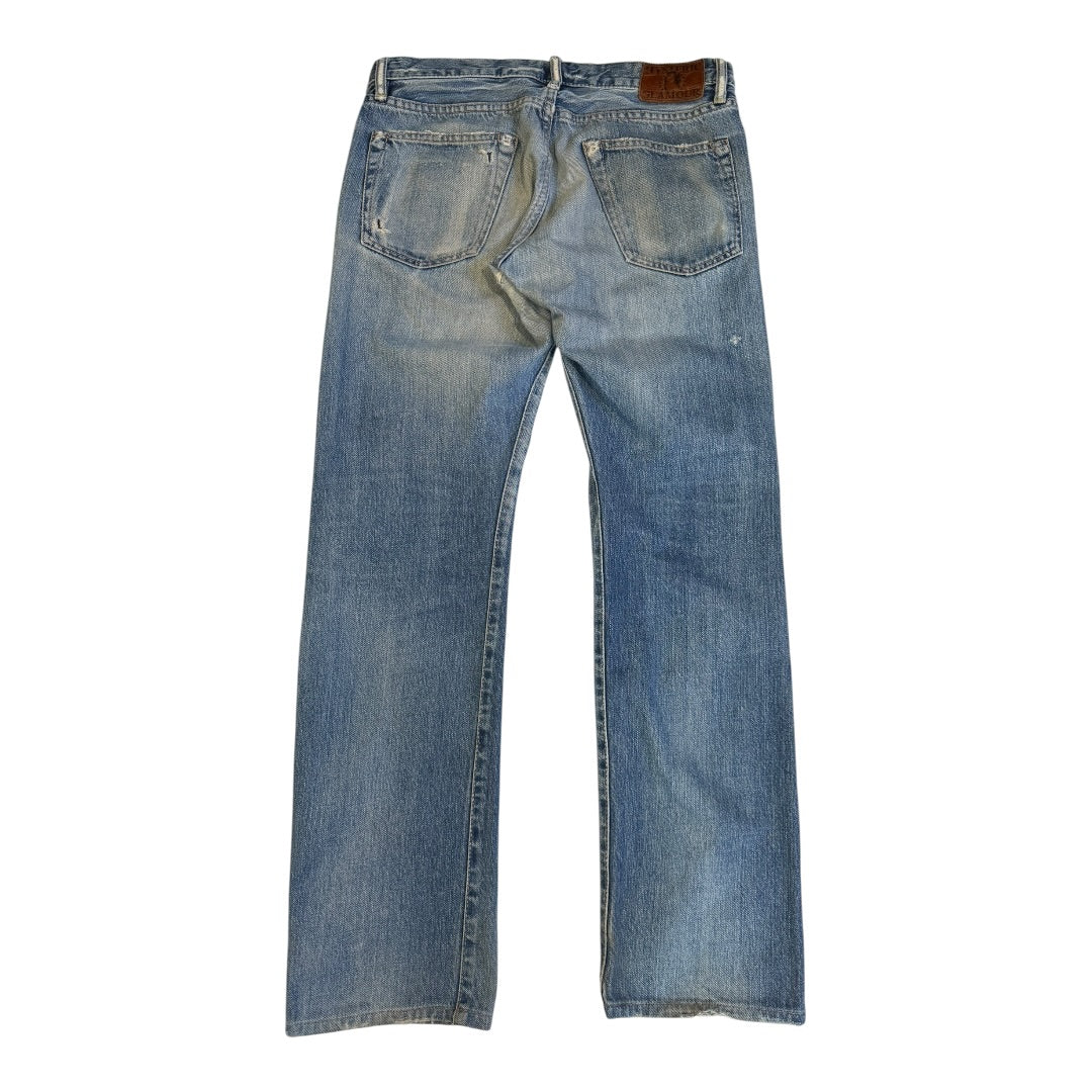 Hysteric Glamour Studded Patched & Repaired Selvedge Denim tagged size 30 measures 31 waist 8 rise 12 back rise 30 inseam 7.25 leg opening. In good used condition.