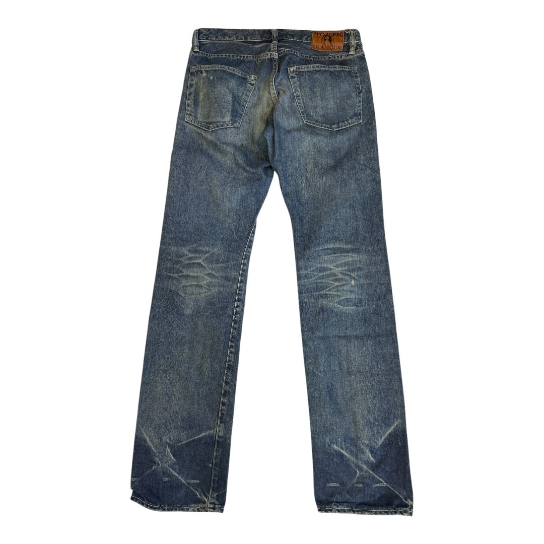 Hysteric Glamour Faded and Distressed Studded Selvedge Denim tagged size 30 measures 31 waist 8.75 rise 12.5 back rise 33 inseam 7 leg opening. Beautiful fade with leather back patch and nice stacking at the shoe.