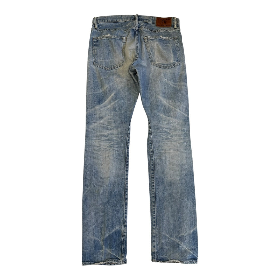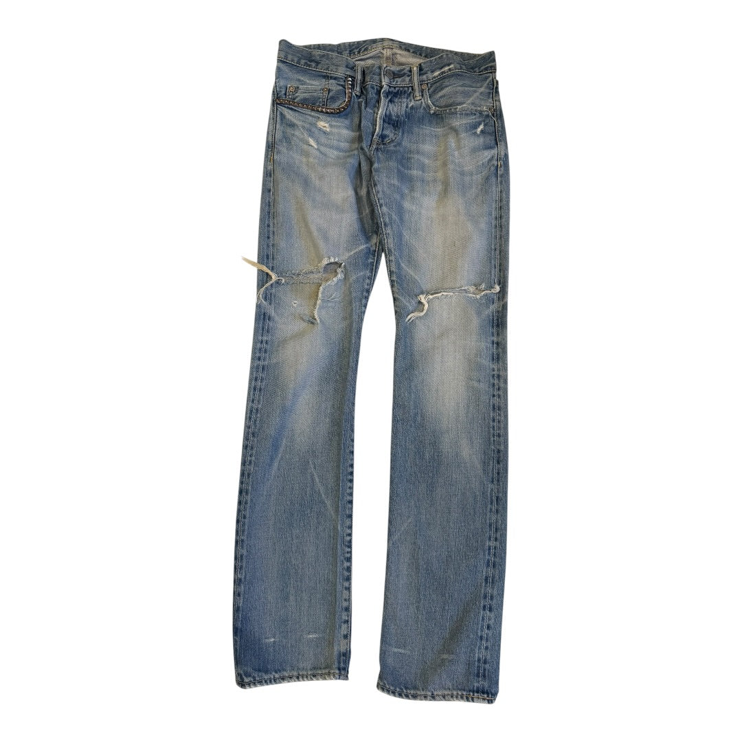 Hysteric Glamour Studded Distressed Selvedge Denim tagged size 30 waist measures 31 rise 8.75 back rise 12.5 inseam 32 leg opening 6.5. In good used condition with blow-outs at the knees.
