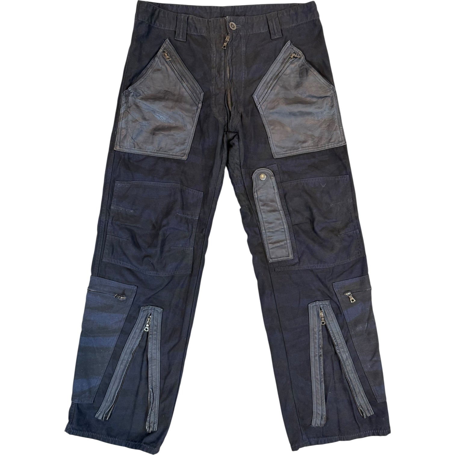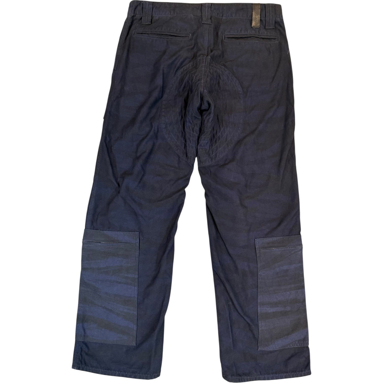 Isamu katayama backlash size M artisanal tonal camo dyed calfskin leather overlay cargo pants in black / blue camo waist 32 rise 13 back rise 14.5 inseam 28.5 adjustable ankle, exposed zipper fly, riri zippers, 9 total pockets
