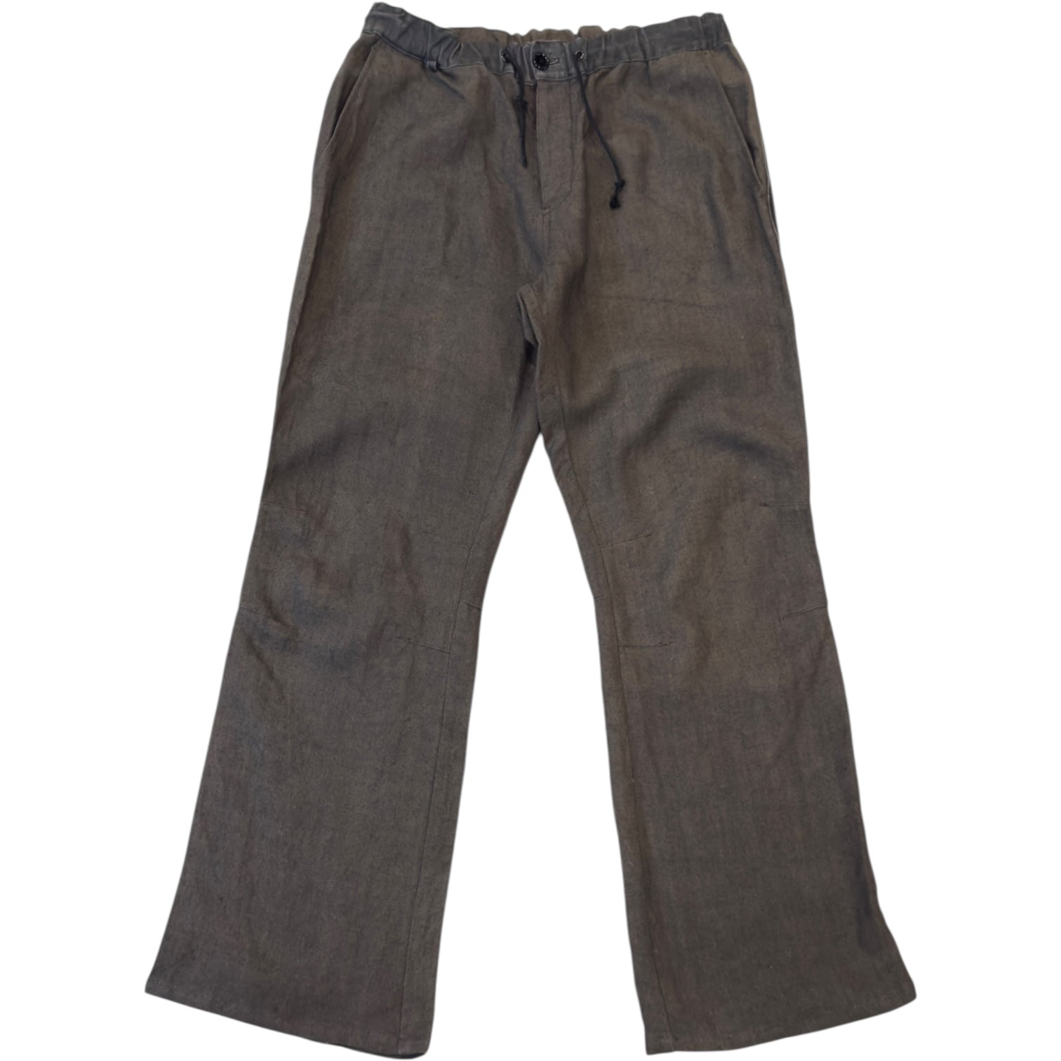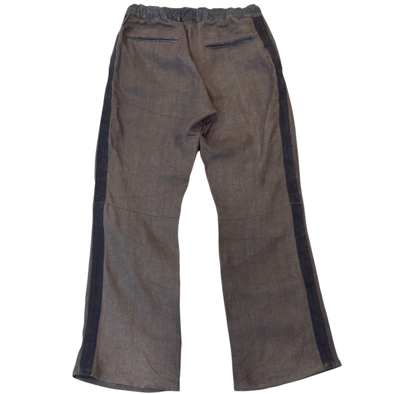 Isamu Katayama BACKLASH Linen Drawstring Pants with Kangaroo Suede Detailing, size M measures 28-34 waist 11.5 front rise 14.75 back rise 30.5 inseam 10.25 leg opening. Midweight linen in dark grey with black Kangaroo suede detailing at the pockets, waistband and side stripe.