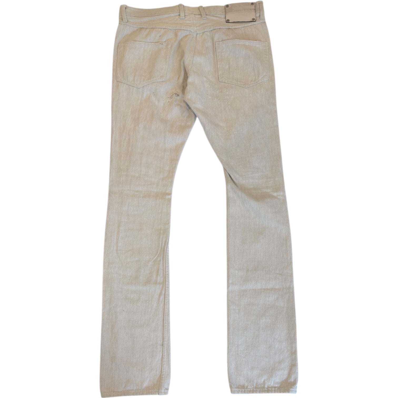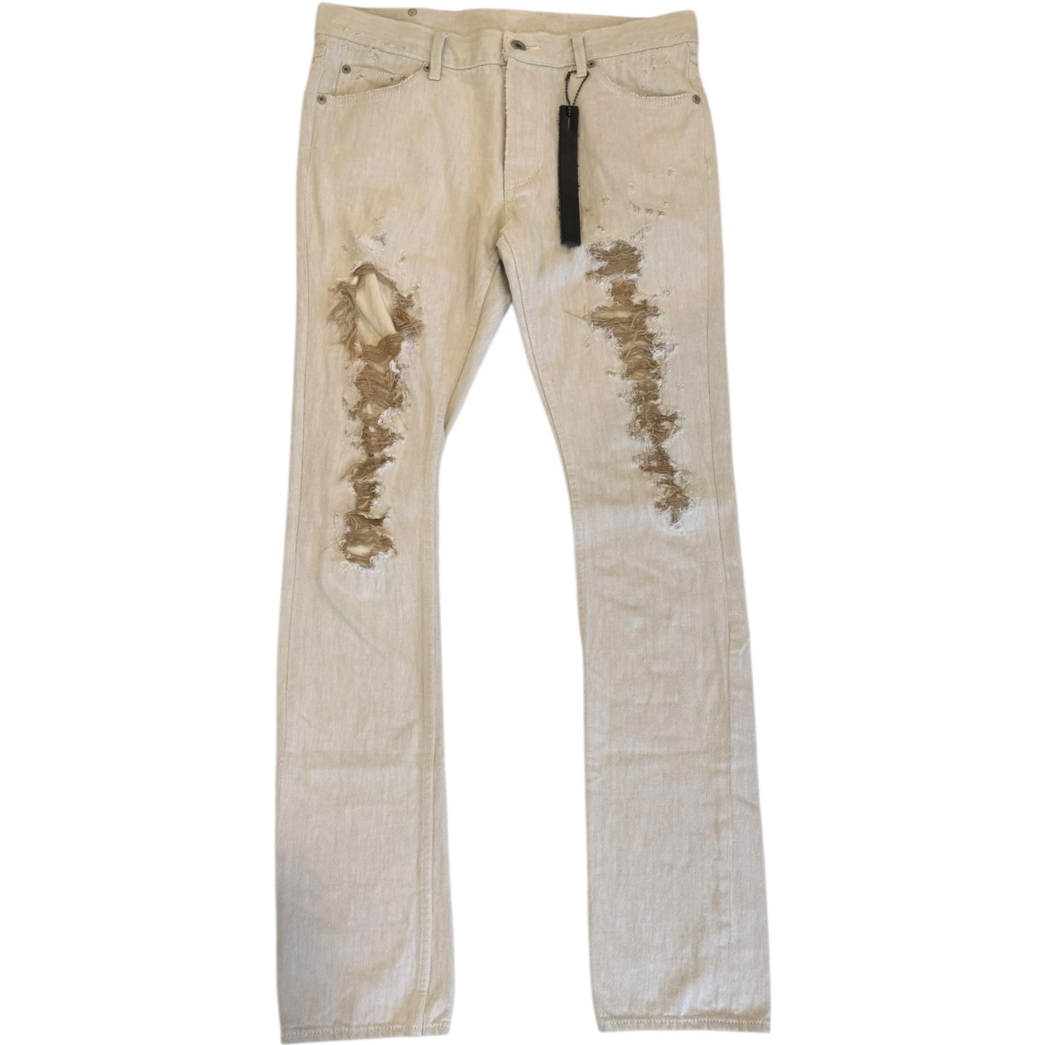Isamu Katayama BACKLASH Distressed Slim Straight Denim, tagged size M. Waist measures 33 rise 9.75 back rise 12.75 inseam 33.5 leg opening 7. Features a natural tone denim composition with neutral tone distressing through out and a white painted cowhide tag. Comes with original tags, likely worn once.