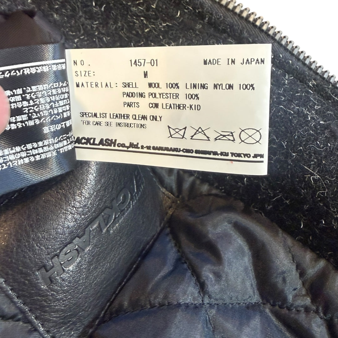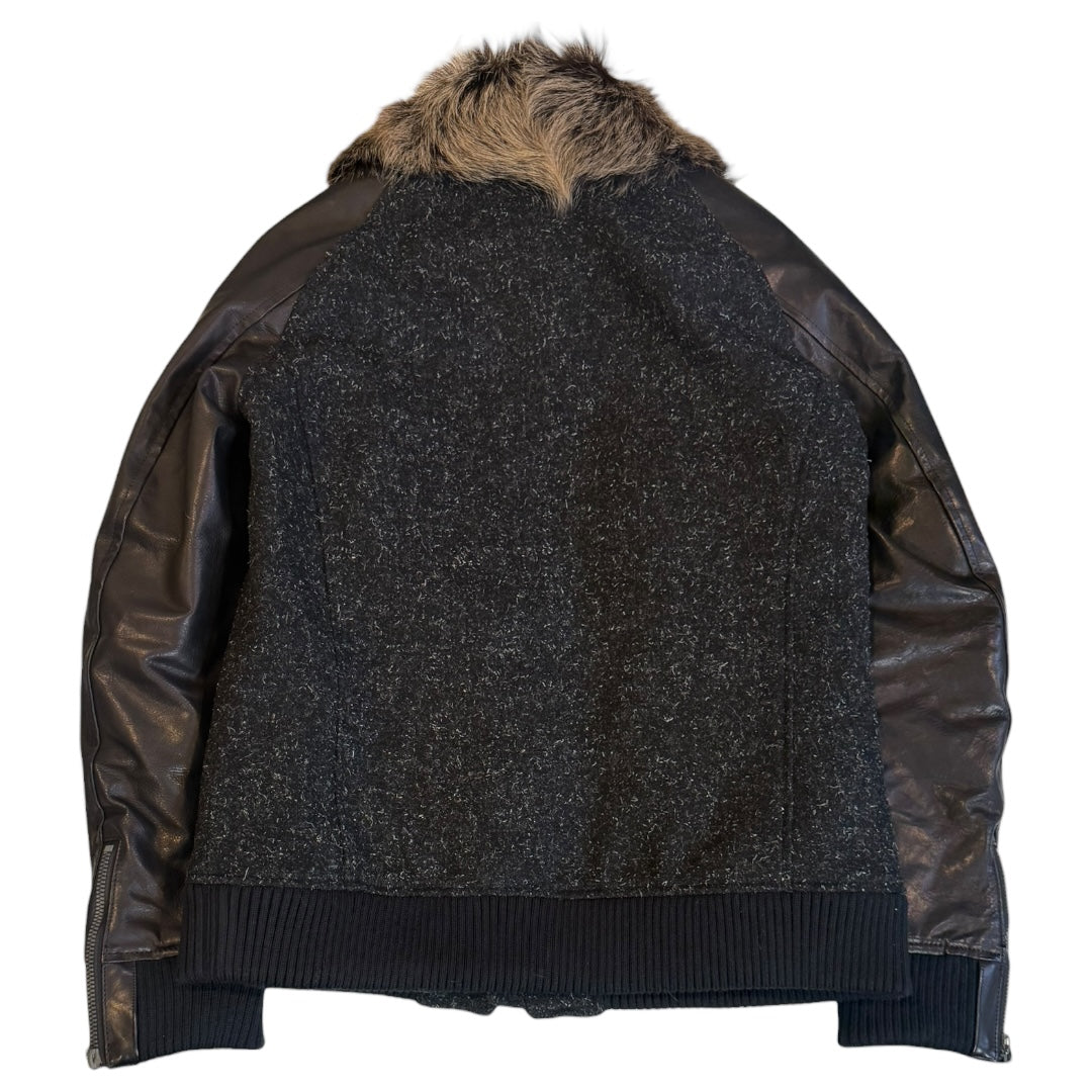 Isamu Katayama BACKLASH Steer Leather and Kid Fur Raglan Stadium Jacket in Black / Natural, tagged size 2 fits M measures 19.75 pit to pit 30.5 sleeves to neck 25.75 length. Features a Riri double zip closure with a long fur neck and thick Steer leather sleeves with adjustable zippered cuffs. In flawless condition.