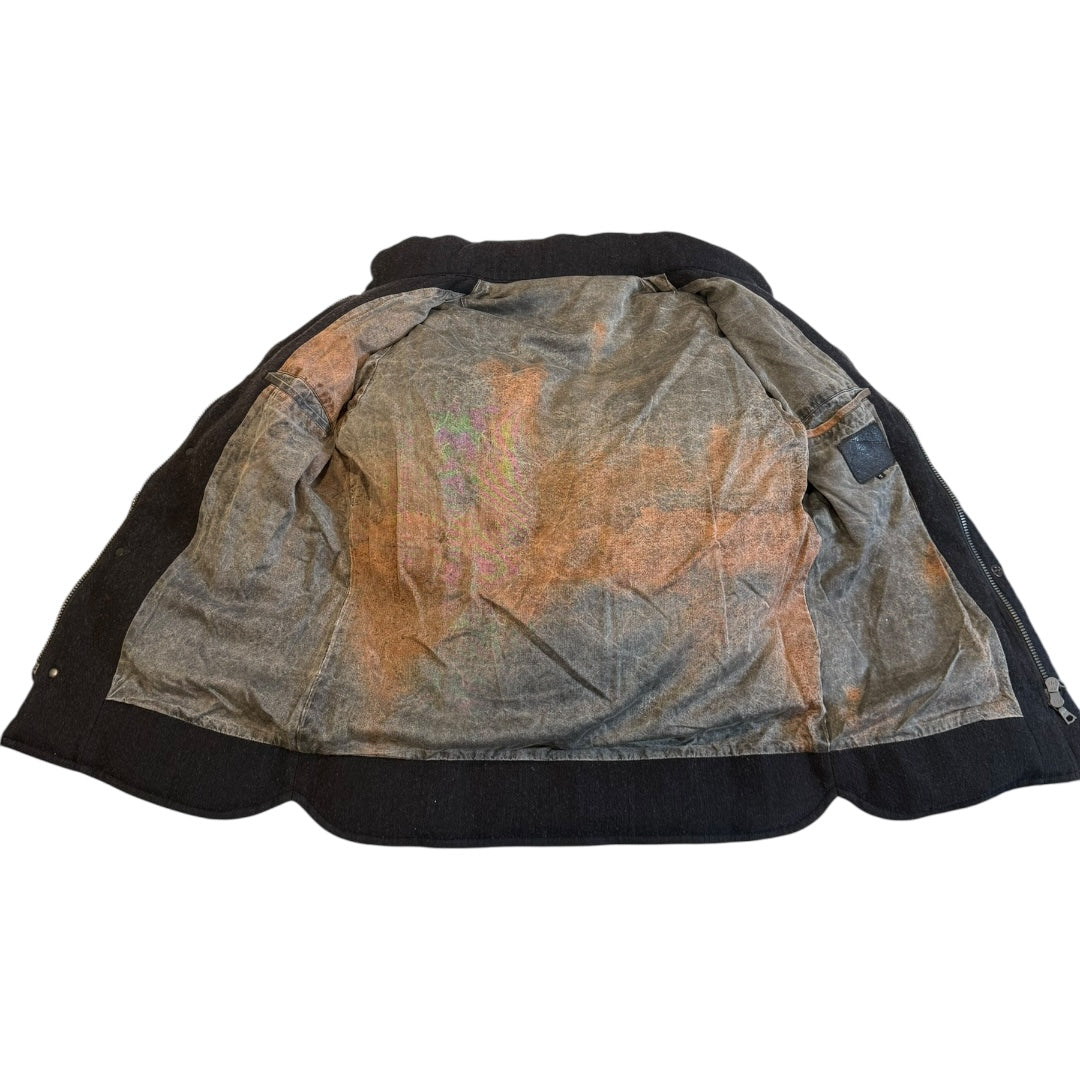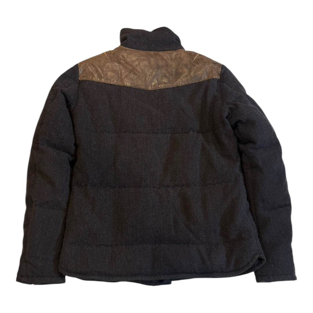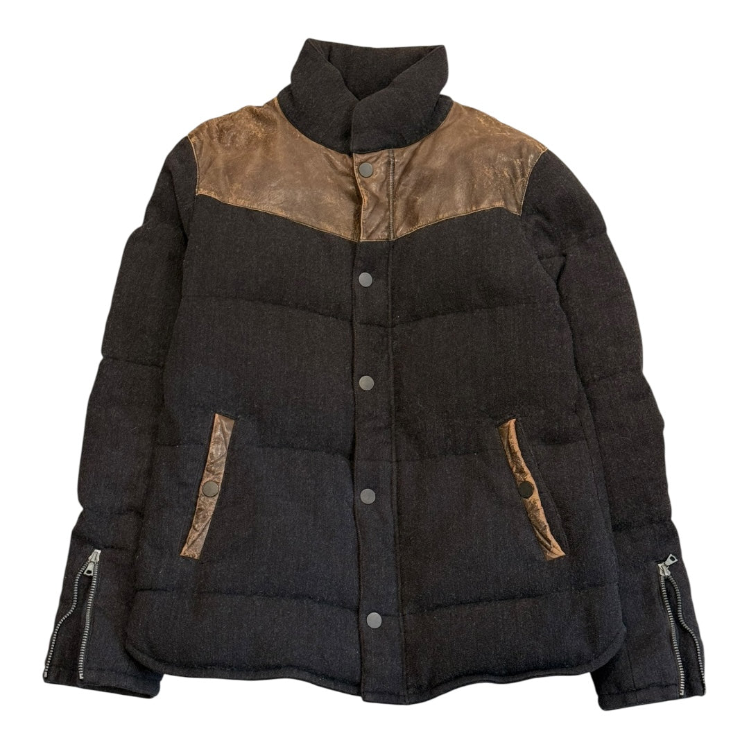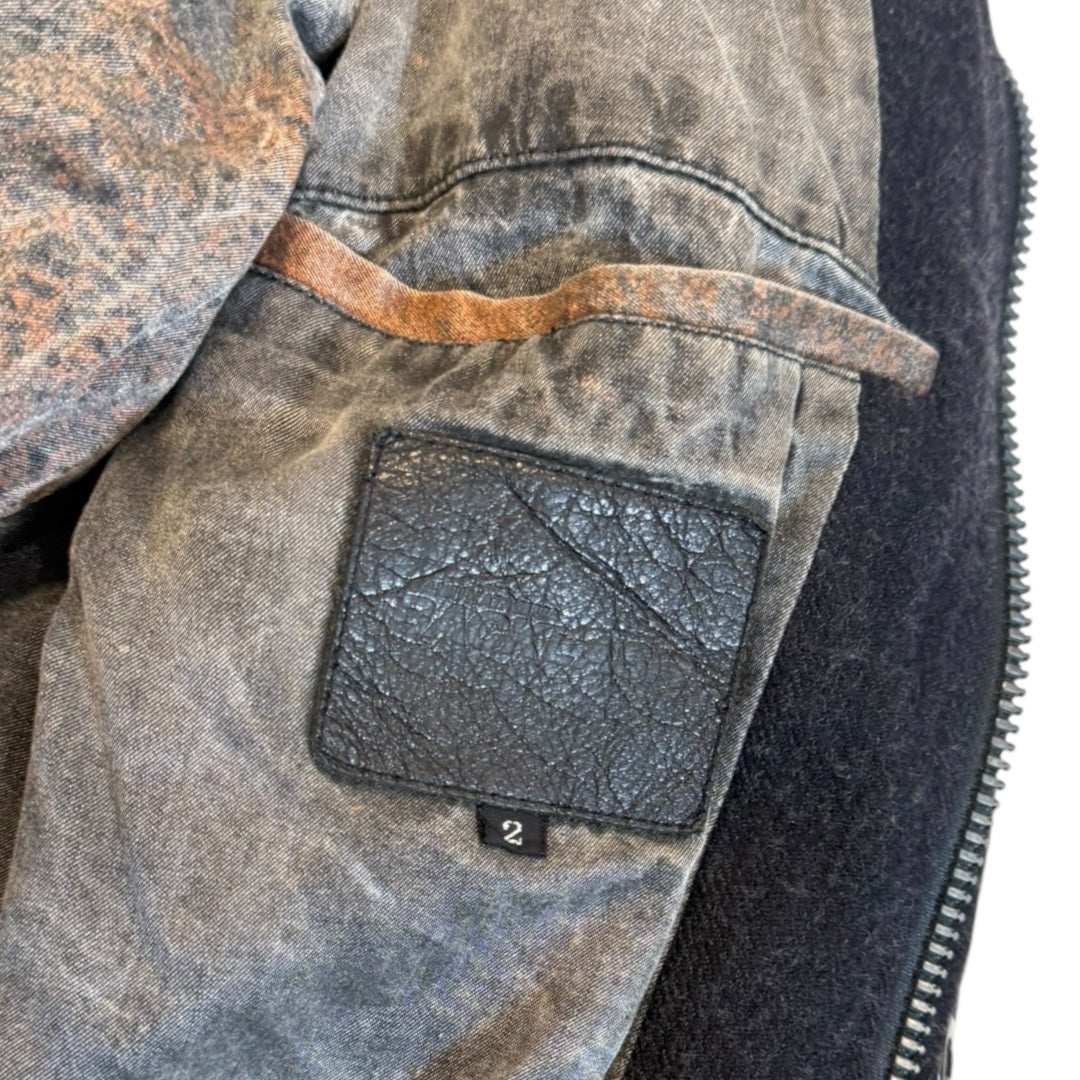 Isamu Katayama BACKLASH Cowhide Paneled Wool Down Jacket, tagged size 2 measures 21.5 pit to pit 17 shoulders 26.5 sleeves 28.5 length. In good condition with some patina developing to cowhide and no noticeable flaws. Features a central Riri double-zip with Cobrax Tra-in snaps.