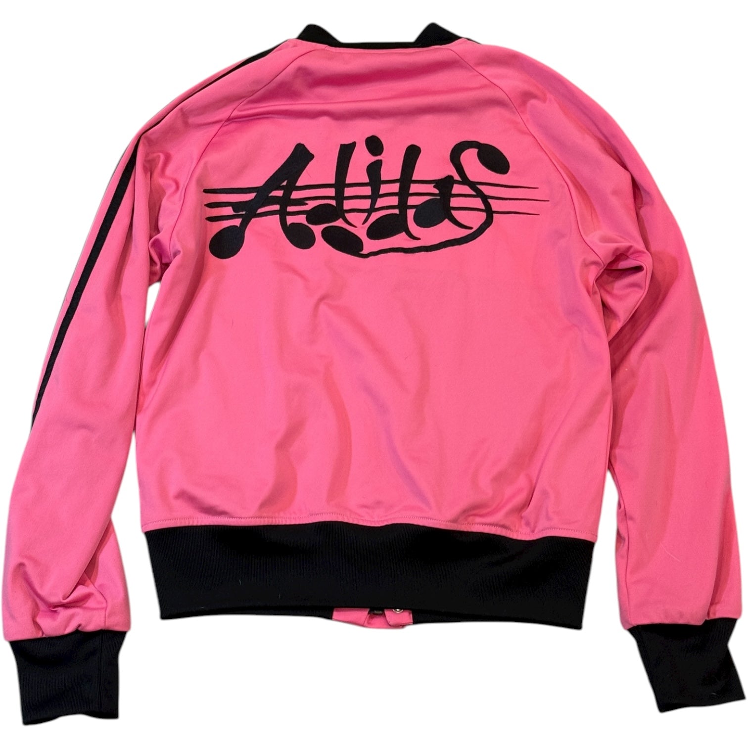 Jeremy Scott X Adidas Guitar Over Embroidered Raglan Cut Track Jacket in Pink. Zip and snap button front closures with two double welted external pockets, a back embroidery and a central guitar motif, highlighted by Adidas three-stripes down the sleeves. No flaws at all, tagged size M measures 20.5 pit to 30.5 sleeves to neck 25.75 length.