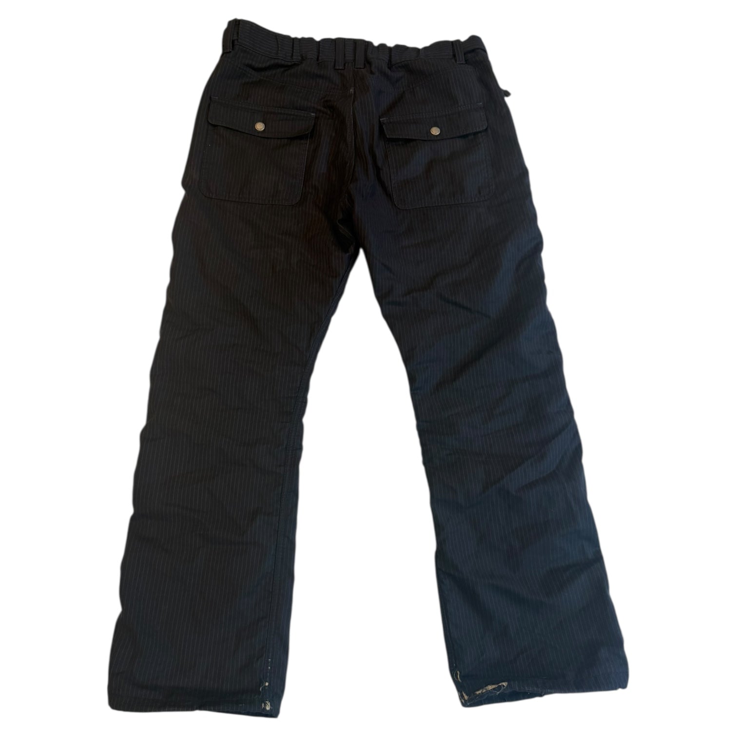 Junya Watanabe Autumn 2005 Black Pinstriped Goretex Pants, tagged size M. Adjustable elastic waist measures 35 unstretched, 32 with Velcro adjusters, 11.5 front rise 14.5 back rise 30 inseam 9 leg opening. Waterproof zippered front pockets, adjustable waist, length, and cuffs with snap closed back pockets in a reinforced double layer Goretex fabric. Wear to top layer visible near back hems and left leg adjuster, otherwise good condition.