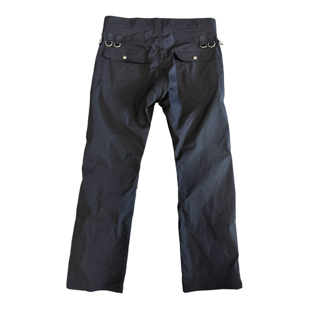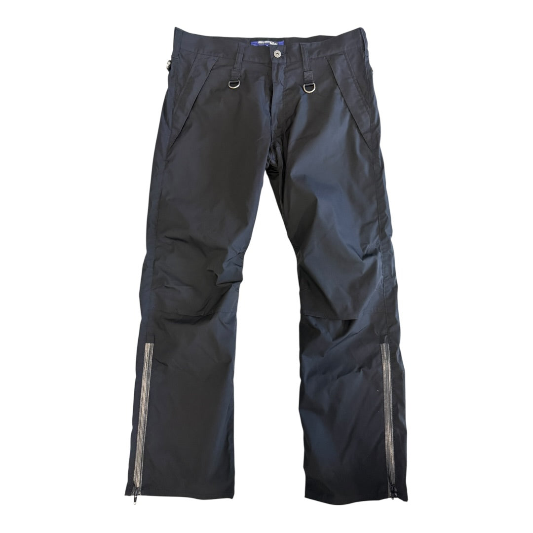 Junya Watanabe Spring 2005 Vented D-Ring Cargo Pants in Black tagged size M waist measures 35 rise 12 back rise 14.5 inseam 29 leg opening 8.5. Featuring vented knees and heat-sealed zipper vents at the ankle and rear, backed with mesh webbing. Crafted from a goretex like material, double layered to the knee. In exceptional condition with no flaws.