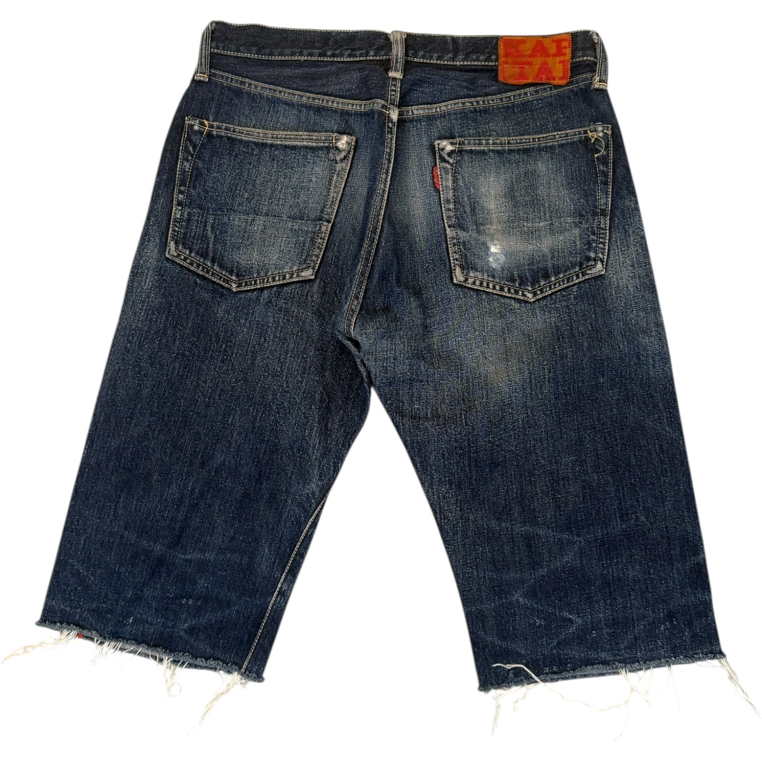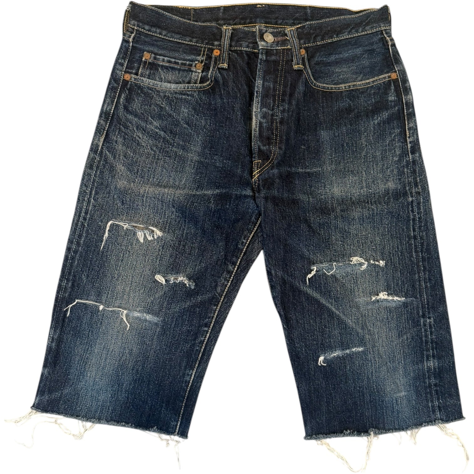 Kapital Distressed Denim Shorts in faded indigo 100% cotton denim. waist 32 rise 10 back rise 13.5 inseam 14.5 leg opening 9