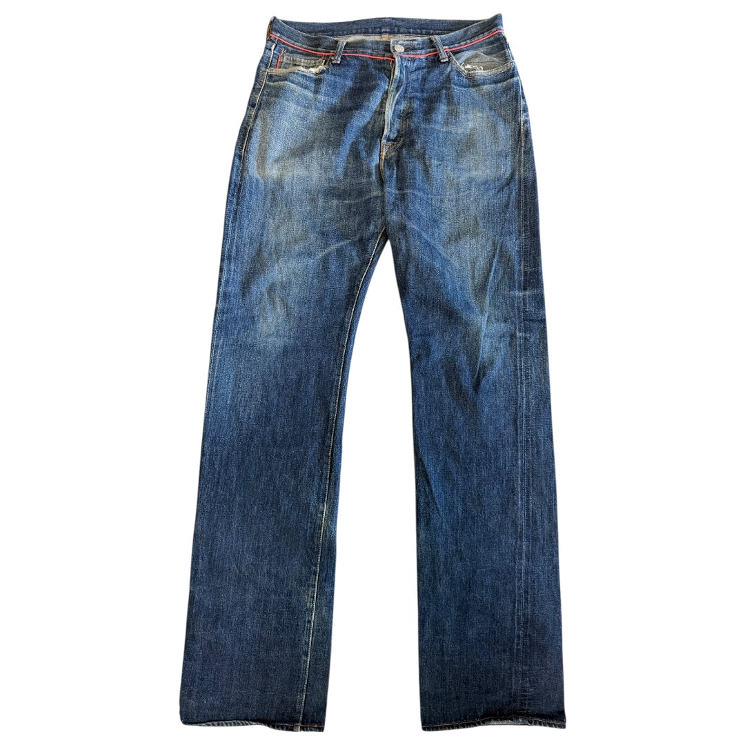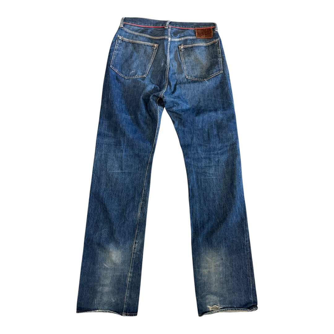 Kapital Legs Selvedge Denim in Indigo tagged size 38 fits like 34-35, waist measures 35 rise 13 back rise 15 inseam 37.5 leg opening 9. Woven leather label, possibly a special order size from the Kapital Legs Craftsman’s store, a specialized Kapital boutique with locations in Shibuya and Tokyo.