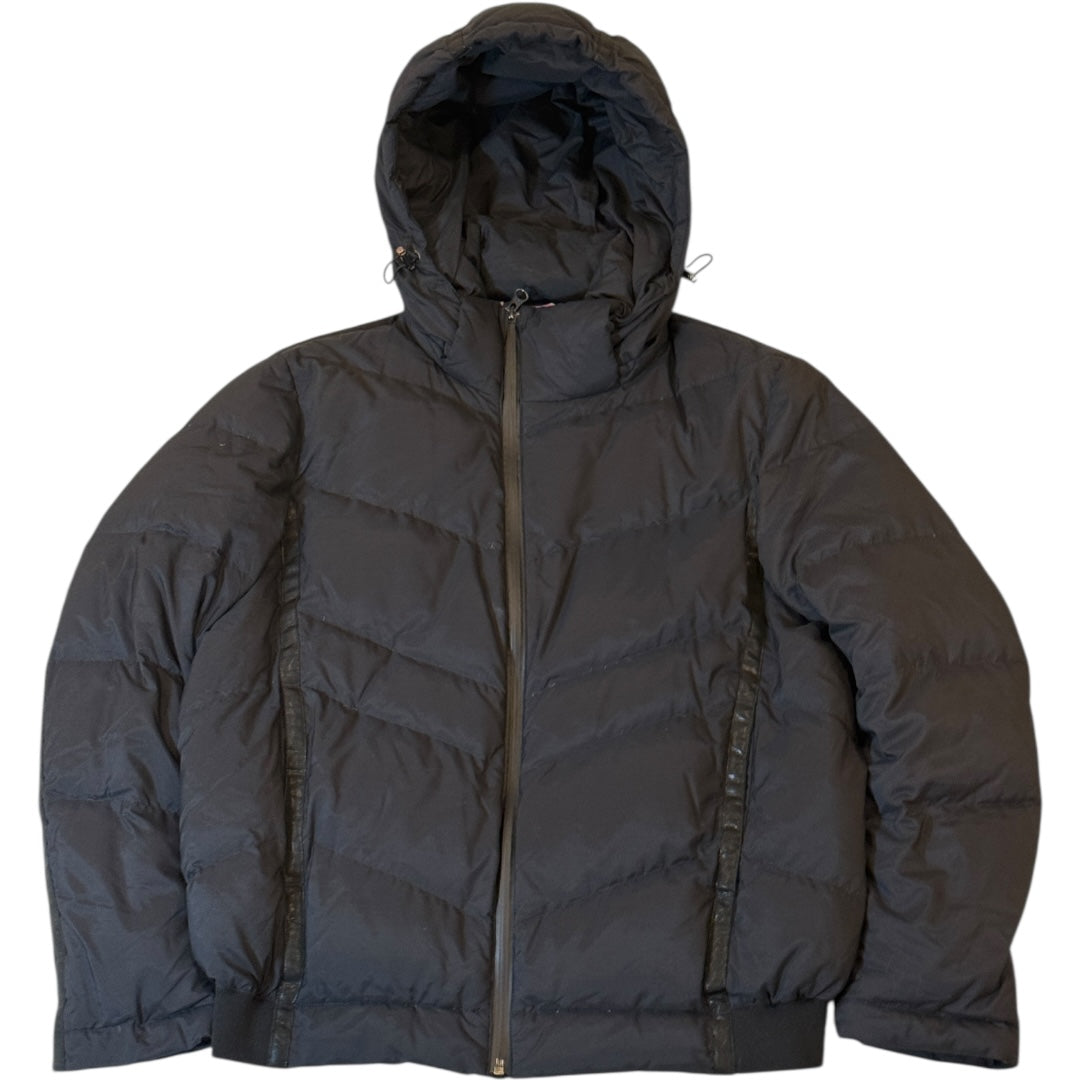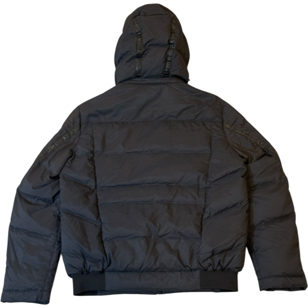 Lanvin en Bleu (Japanese diffusion line) Asymmetrical Down-filled Hooded Cropped Jacket with Removable Hood in Black. Sleek sideline features darting down body, as well as on sleeves and hood with a waterproof zipper and adjustable hood with metal bungee connectors. Extremely comfortable silky lining, size XL fits Large measures 23 pit to pit 18 shoulders 25 sleeves 24.75 length