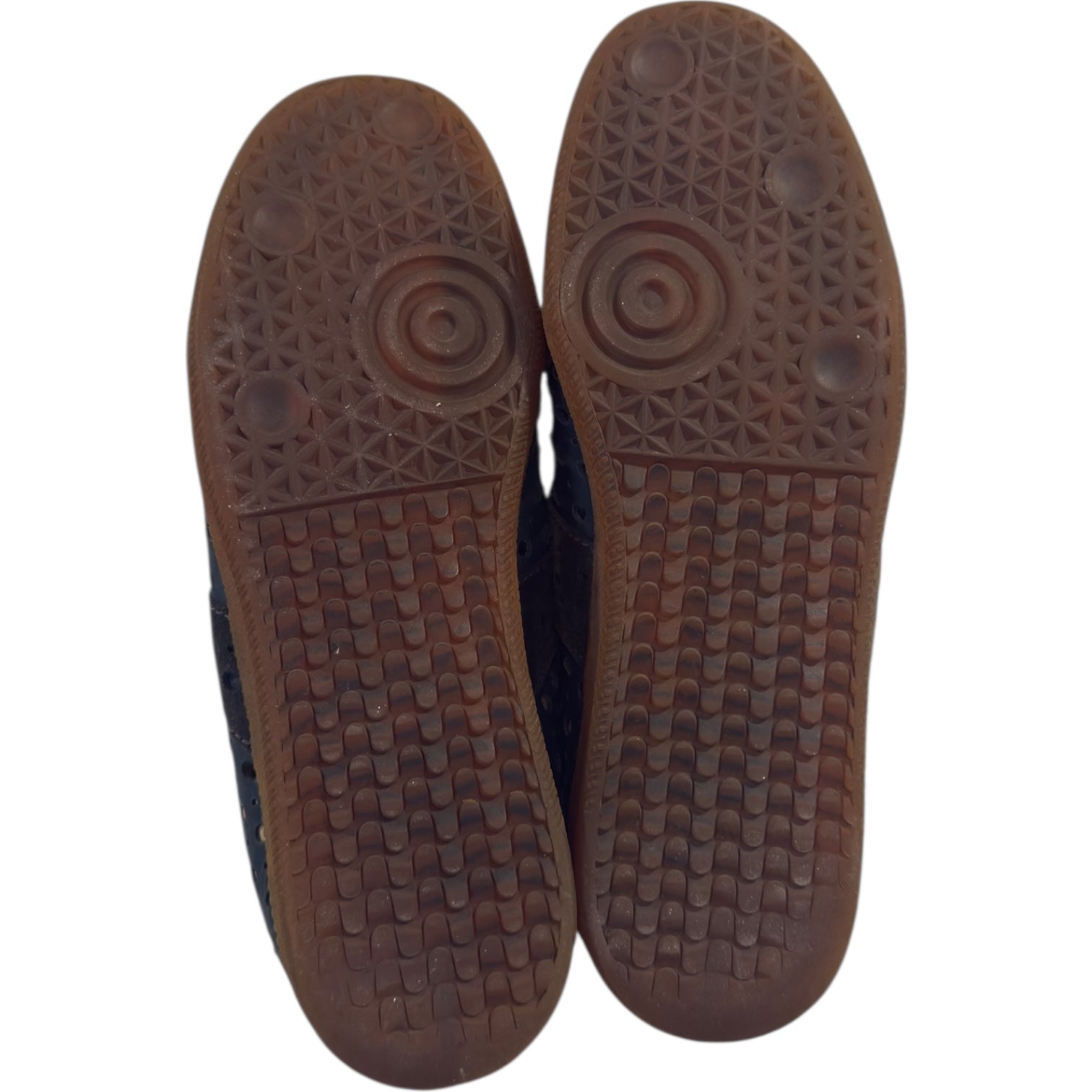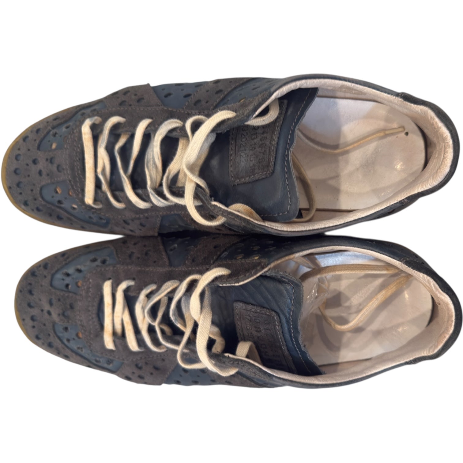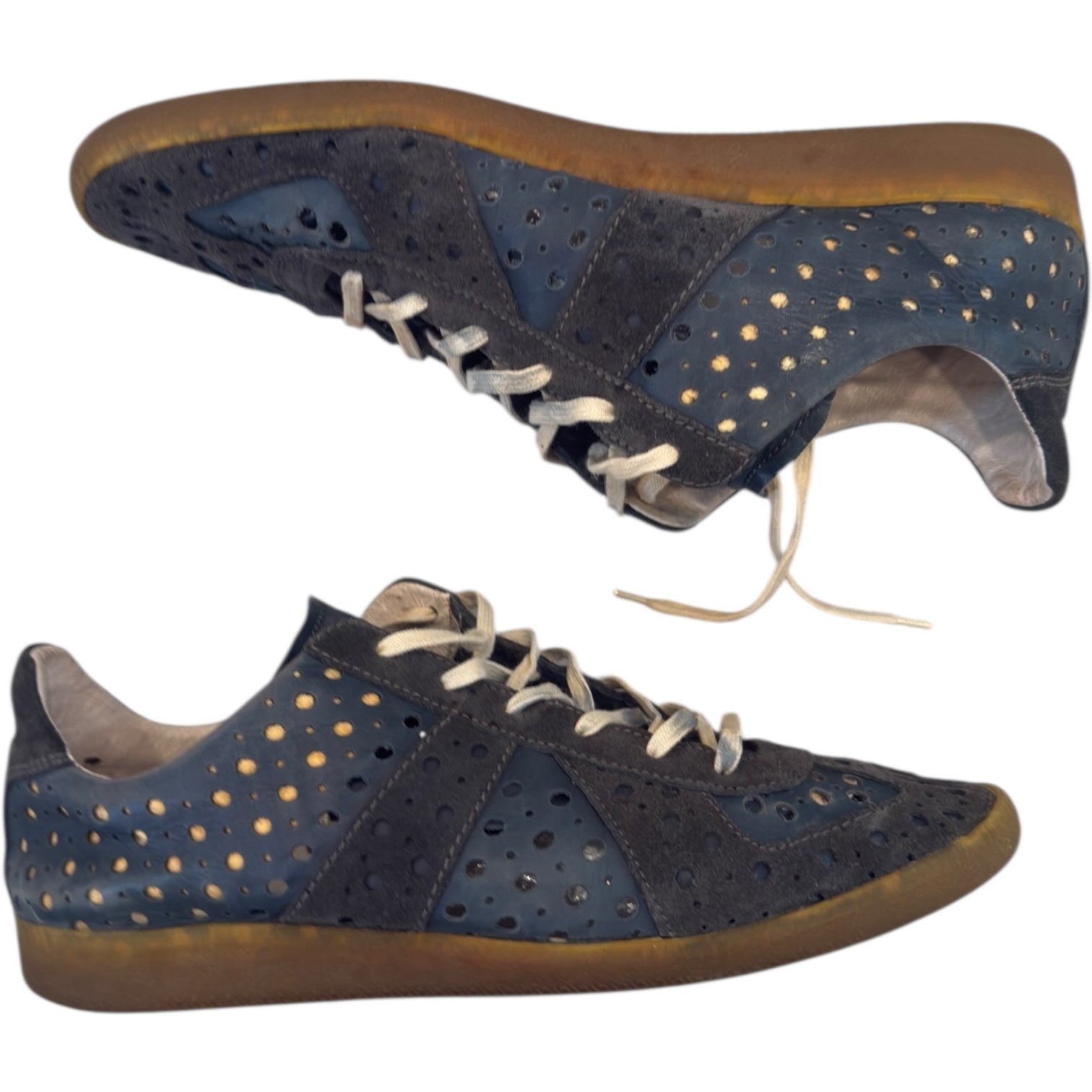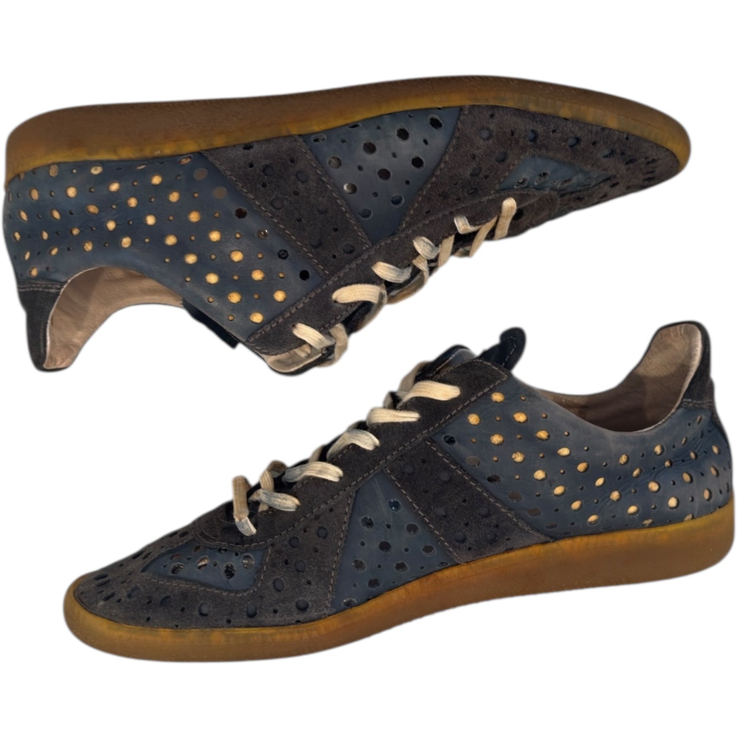 Maison Margiela Hole-Punched Artisanal German Army Trainer in Blue Calfskin and Grey Suede. This rare pair of Margiela’s GAT sneaker features a delicate hole punch pattern on its upper, revealing the shoes construction underneath. Tagged size 43, fits US9.5-10.5, this model is most often seen in women’s sizing. Some creasing due to leather fabrication, this shoe’s upper is very fluid and extremely comfortable. In solid used condition with some minor sole separation and no heel drag. Don’t miss this chance to score one of Margiela’s best GAT variations in a wearable size.