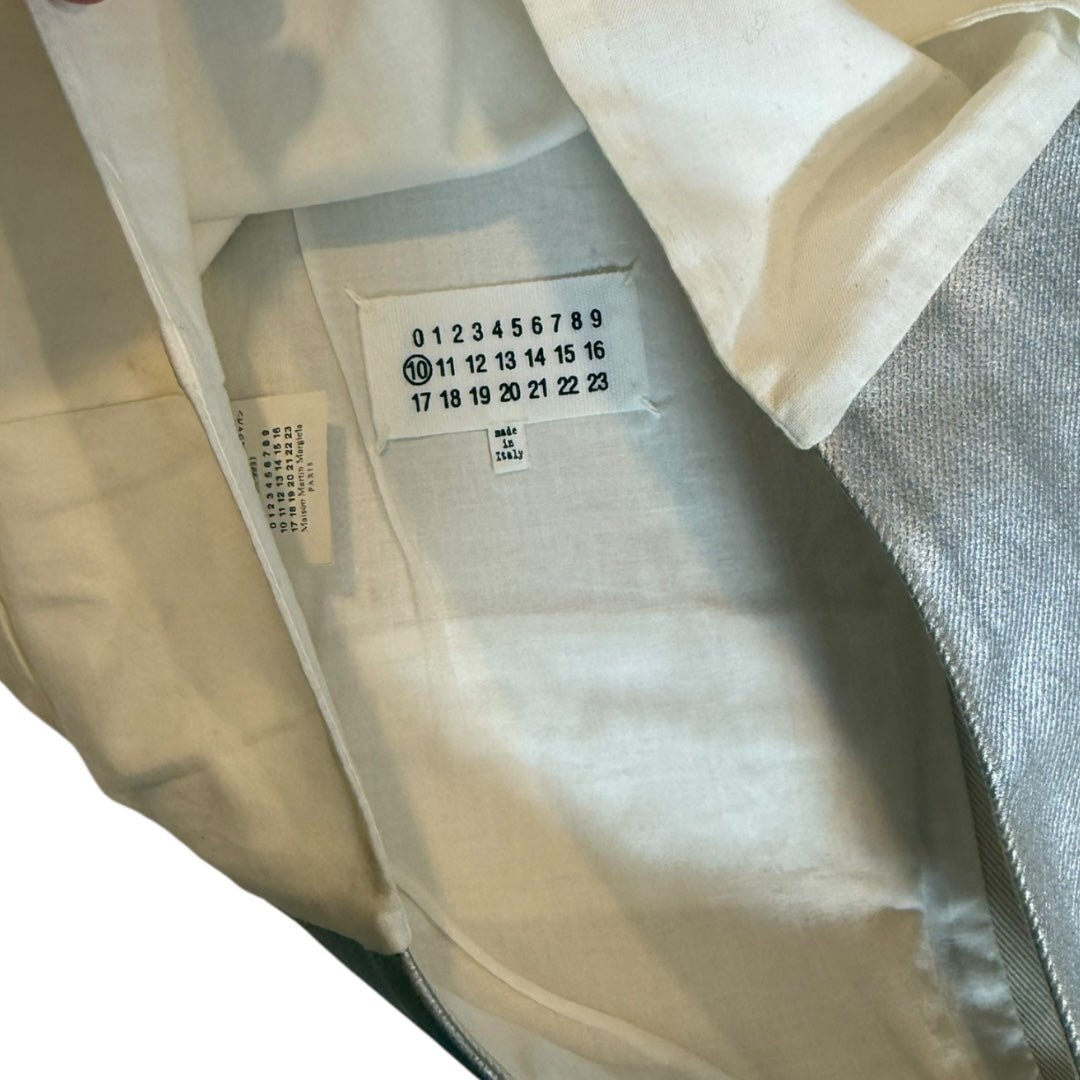 Maison Margiela Spring 2013 Runway Silver-Painted Denim Gilet / Vest, no tagged size, fits like XS-S measures 18.5 pit to pit 12.75 shoulders 24 length. Discoloration and staining at inside and back neck, reflected in price.