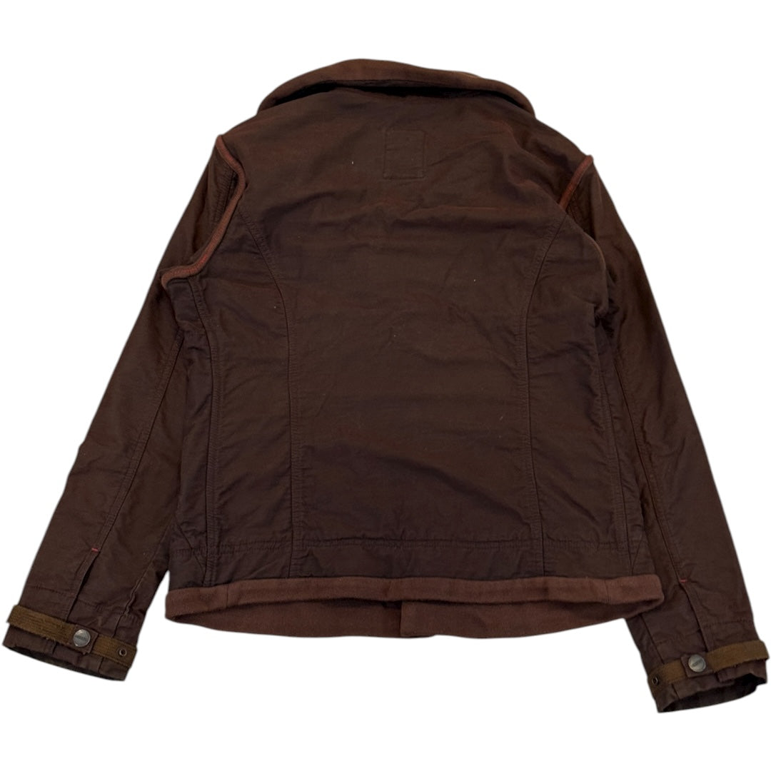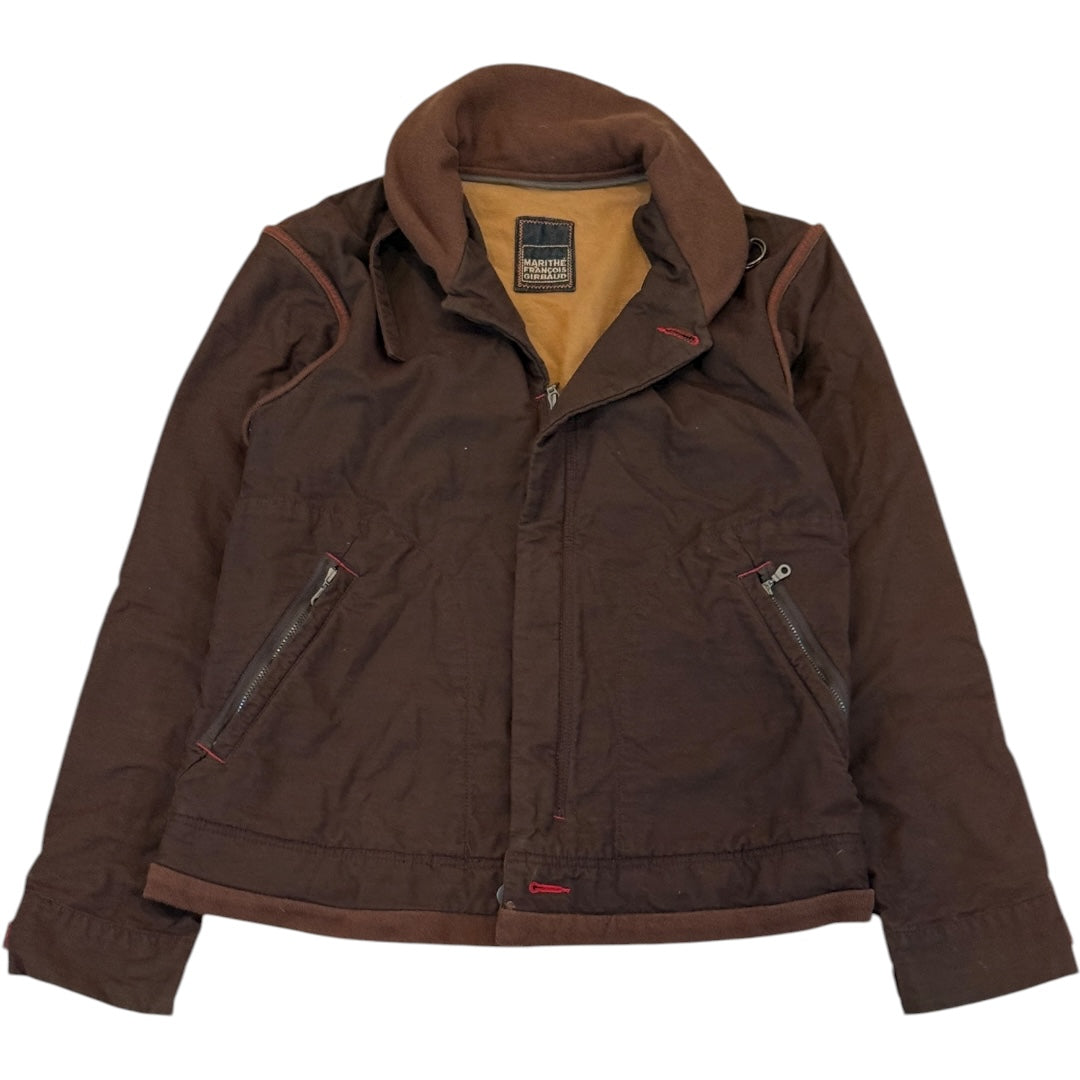 Marithe + Francois Girbaud Late 90s / Early 00s Adjustable Shawl Collar Jacket in Brown Cotton Twill. This sturdy cotton twill jacket features zip and button closures with adjustable ribbing at the neck and cuffs and an ultra soft cotton lining, with serge stitch accenting in red. Measures 20.5 pit to pit 18 shoulders 24.25 sleeves 25 length, best for Men’s S-M women’s L-XL. Some minor discoloration no other flaws