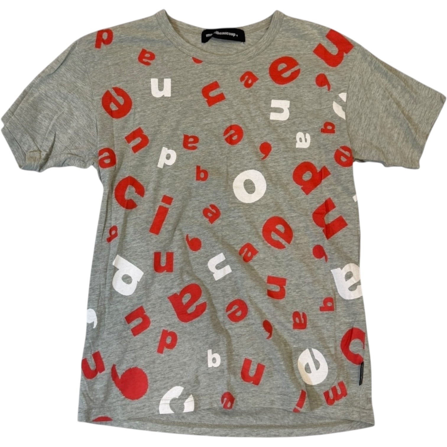 Mercibeaucoup by Tsumori Chisato Grey Letter Print T-Shirt fits M-slim L measures 19.5 shoulders 19.5 pit to pit 26 length. Great used condition with no noticeable flaws
