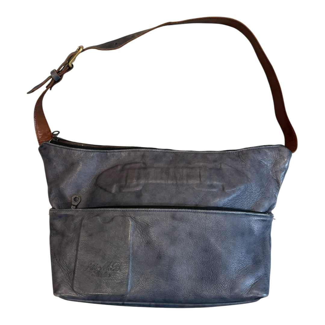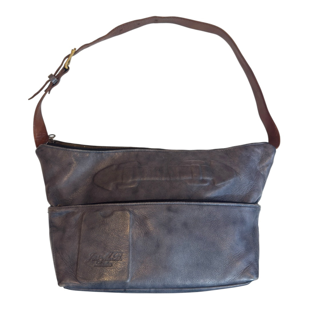 Late 00’s Mihara Yasuhiro x JAS M.B. Shoulder Bag in thick Object-Dyed Blue Cowhide. This uniquely shaped bag features compartments each with brass zippers, as well as heat-embossed detailing revealing the imprint of internal buckles and cardholder. Adjustable carrying strap, fully lined, made by hand in the UK. Top length 18.5 bottom length 12.5 height 10.5 inches