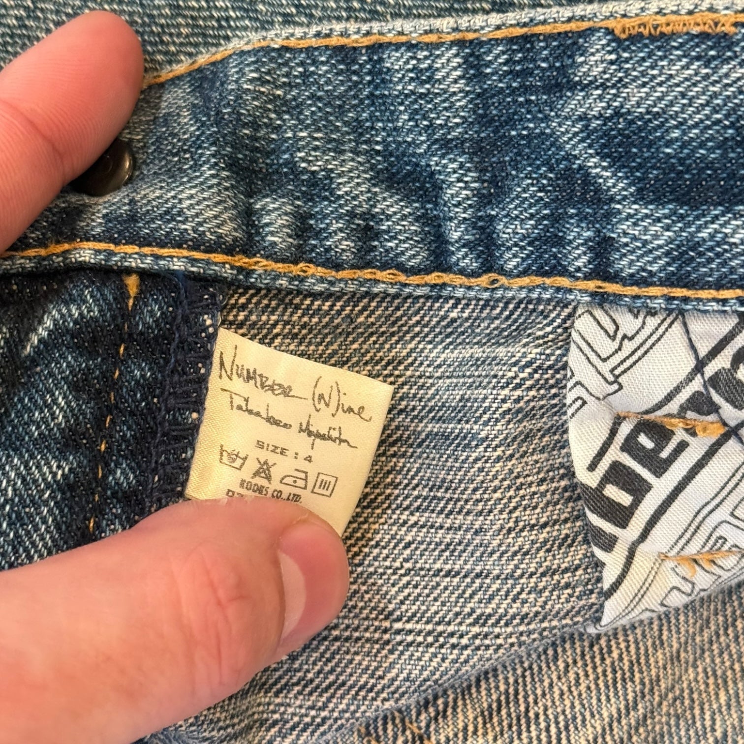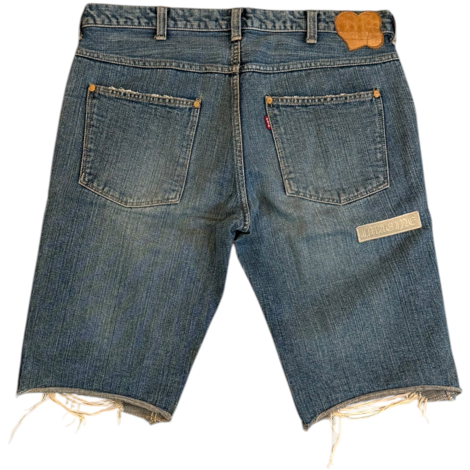 Number (N)ine by Takahiro Miyashita AW2004 Give Peace a Chance patched and distressed shorts. Tagged size 4 – fits 34" waist. Features layered paneling, exposed stitching, and intentional distressing throughout. No flaws.